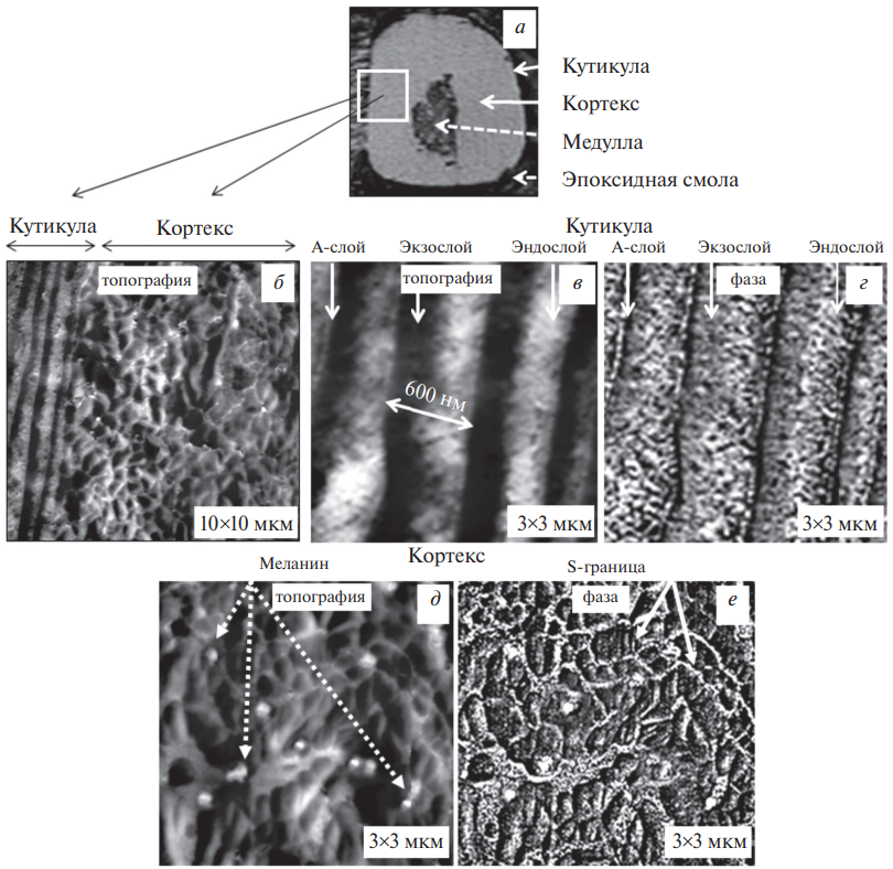 Рис. 5. Особенности внутренней структуры волоса в перпендикулярном сечении: а – оптическое изображение микротомированного волоса, импрегнированного в эпоксидную смолу; б – топографическое изображение внешней кутикулярной зоны (слева) и части зоны кортекса (справа); в и г – детальные топографическое и фазовое изображения кутикулы; д и е – детальные топографическое и фазовое изображения кортекса.