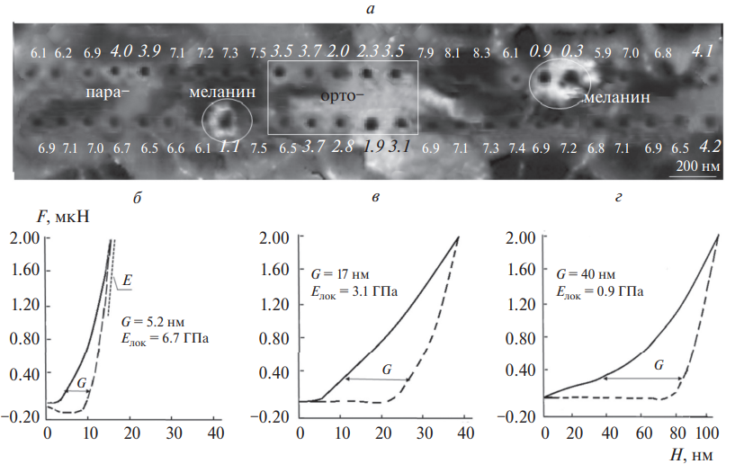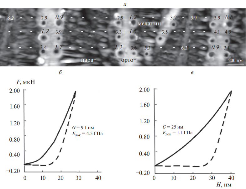 Рисунок 10а иллюстрирует топографию продольного сечения зоны кортекса со следами индентов и значениями локального модуля Юнга. В этой зоне удалось получить силовые кривые лишь в монолитных кератиновых областях, расположенных вдоль основной оси волоса, где средний локальный модуль Юнга оказался равным Елок = (4.2 ± 0.4) ГПа. Однако в темных по контрасту (низлежащих) областях СК, которые можно было бы принять к рассмотрению, не воспроизводились. Вероятно, это происходило из-за того, что зонд при извлечении из материала зацеплялся за поперечные дисульфидные связывающие тяжи, и начальный наклон разгрузочной кривой достоверно не воссоздавался. Модуль упругости в местах локализации меланина равнялся Елок, мел = = (1.0 ± 0.3) ГПа.