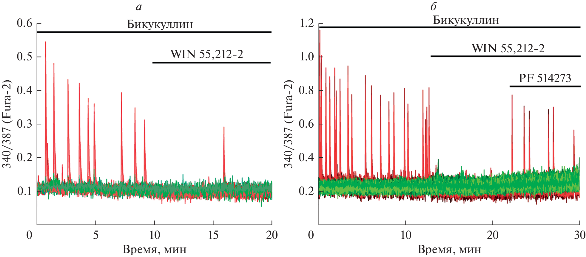 Cannabinoid receptors (CBRs) play a key role in various physiological processes, including neurogenesis, synaptic plasticity, immune modulation, cell apoptosis, metabolism regulation, cardiovascular and reproductive systems activity. Since activation of CBRs suppresses hyperexcitation and protect cells from death, their modulation may have therapeutic prospects in the treatment of such pathologies of the nervous system as mental disorders, epilepsy, Parkinson’s and Huntington’s disease, multiple sclerosis, spinal cord and brain injuries. This paper presents experimental data on the effects of the cannabinoid receptor agonist WIN 55,212-2 on the induced oscillations of intracellular Ca2+ concentration ([Ca2+]i) in two in vitro models of epileptiform activity. To study the neuroprotective properties of WIN 55,212-2, hyperexcitation was induced by the application of a GABA(A) receptor antagonist, bicuculline, or depolarizing doses of ammonium chloride. As experiments have shown, WIN 55,212-2 at a concentration of 100 nM and above significantly suppresses the [Ca2+]i oscillation frequency and reduces the basal [Ca2+]i level. At the same time, the amplitude of calcium oscillations also decreased in the presence of the agonist. WIN 55,212-2 at a concentration of 5 μM suppressed NH4Cl-induced [Ca2+]i oscillations in all neurons but caused a transient biphasic increase in the basal [Ca2+]i level in 20% of astrocytes. Thus, in this work, using various models of hyperexcitation of neuronal networks, we have demonstrated the potential antiepileptic effect of the cannabinoid receptor agonist WIN 55,212-2.