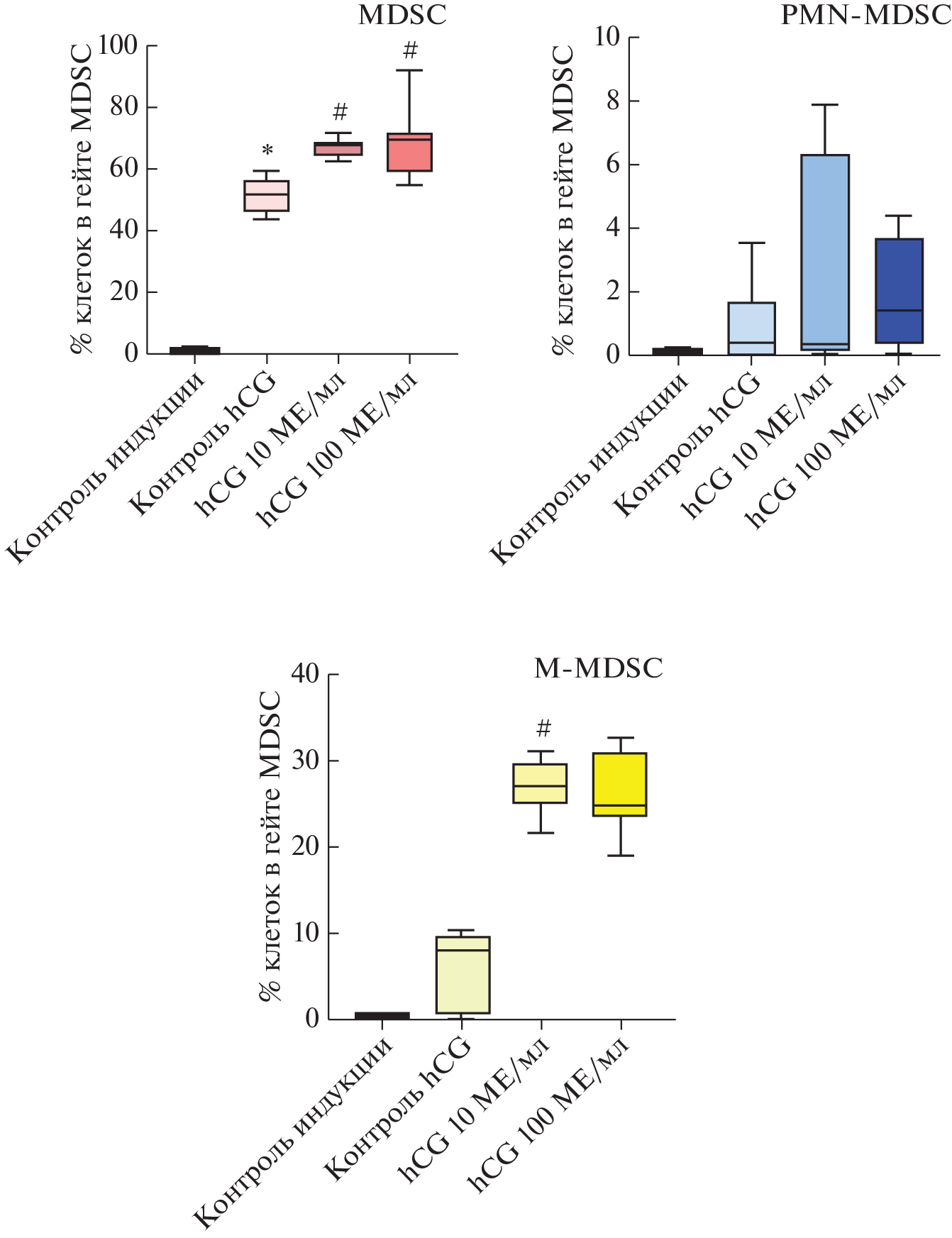 Изучали влияние рекомбинантного хорионического гонадотропина человека (hCG) в концентрациях, соответствующих беременности (10 и 100 МЕ/мл) на дифференцировку и функциональную активность миелоидных супрессорных клеток (MDSC). Объектом исследования были изолированные CD11b+-клетки, которые индуцировали в фенотип MDSC при помощи двухэтапного активирования цитокинами GM-CSF, IL1β и липополисахаридом (LPS). После недельного культивирования оценивали общий уровень MDSC с учетом субпопуляций M-MDSC и PMN-MDSC, экспрессию аргиназы-1 (Arg1) и индоламн-2,3-диокигеназы (IDO) в этих клетках, а также цитокиновый профиль в супернатантах культур клеток. Показано, что hCG повышал уровень общего количества MDSC, а его более низкая концентрация (10 МЕ/мл) способствовала дифференцировке субпопуляции M-MDSC. Установлено, что hCG не оказывал влияния на экспрессию IDO в MDSC, однако наблюдалась тенденция к повышению экспрессии IDO под воздействием hCG в концентрации 10 ME/мл. Показано, что CD11b+-клетки, индуцированные в фенотип MDSC, экспрессируют низкое количество Arg1, что не позволило оценить эффект гормона на экспрессию этого фермента. При оценке цитокинового профиля методом мультиплексного анализа установлено, что hCG не модулировал продукцию цитокинов в культуре CD11b+-клеток, индуцированных в фенотип MDSC. Таким образом, впервые продемонстрировано, что hCG способен индуцировать дифференцировку MDSC.