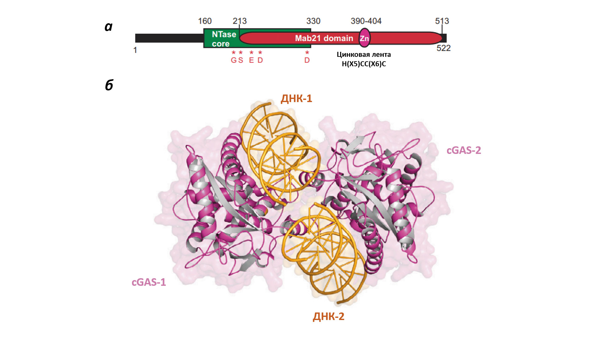 Белок cGAS впервые был обнаружен как сенсор ДНК в цитоплазме клеток L929 и THP-1 [9]. сGAS имеет молекулярную массу 60 кДа и представляет собой циклическую GMP–AMP-синтазу из семейства нуклеотидилтрансфераз, преимущественно локализуется в цитоплазме, а также может находится в ядре. cGAS состоит из неструктурированного N-конца (1–160 а. о.) и высококонсервативного C-конца (161–522 а. о.) (рис. 2). Предполагается, что остатки лизина и аргинина, входящие в сос-тав N-концевого фрагмента, участвуют в связывании ДНК. Кроме этого, N-конец служит для присоединения cGAS к плазматической мембране. C-конец cGAS содержит два сильно консервативных домена — нуклеотидилтрансферазный домен (160–330 а. о.), необходимый для ферментативной активности, и Mab21-домен (213–513 а. о.), включающий мотив «цинковая лента», который участвует в связывании ДНК и димеризации cGAS, и остаток лейцина, регулирующий синтез циклических динуклеотидов [12]. В отсутствие ДНК сGAS находится в автоингибированном состоянии. При нахождении нуклеиновых кислот в цитоплазме сGAS димеризуется и формируется комплекс cGAS–ДНК (2:2).