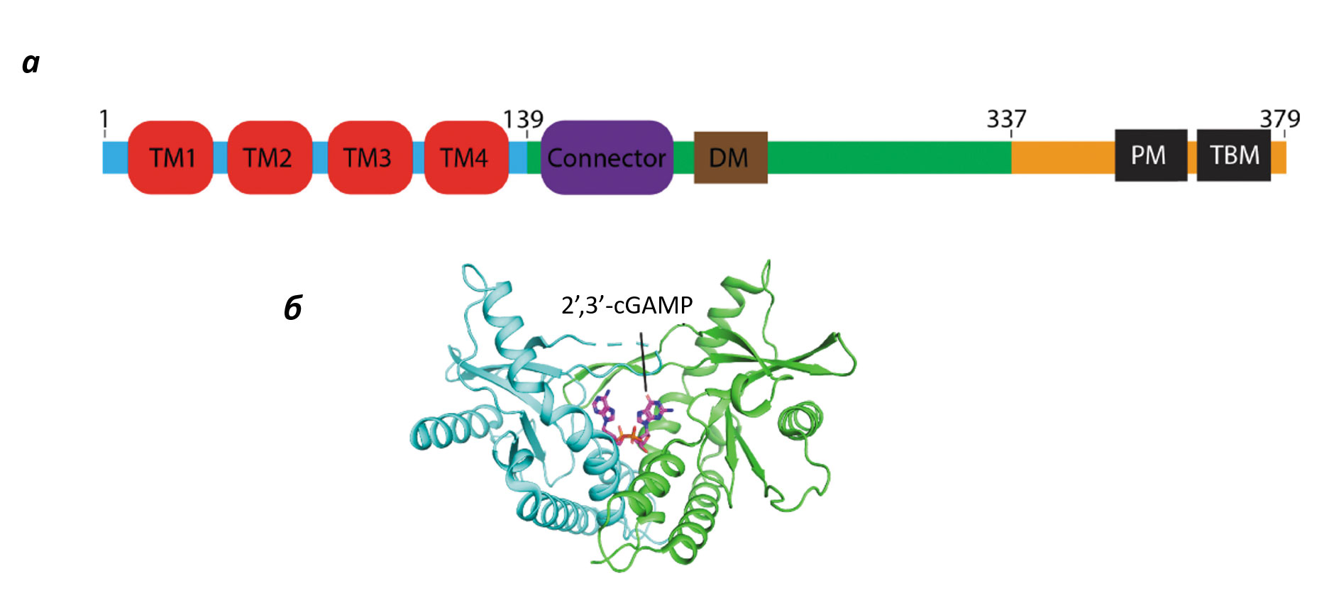 Белок STING считается одной из ключевых молекул, участвующих в реакции на патогены и активирующий провоспалительные цитокины при адаптивном иммунном ответе. Впервые STING был обнаружен в экспериментах с применением скрининговой системы экспрессии, в которой примерно 5500 человеческих и 9000 мышиных полноразмерных комплементарных кДНК, содержащих репортерный ген люциферазы под промотором IFN-β-Luc, были трансфецированы в клетки HEK293Т, для того чтобы определить участников альтернативного TRL-независимого сигнального пути врожденного иммунитета, сопровождающегося продукцией интерферонов [26]. В результате этой работы был идентифицирован белок STING (молекулярный вес 42 кДа, 379 а. о.), который преимущественно располагался в ЭПР. STING заякорен в ЭПР N-концевым фрагментом, включающим четыре трансмембранных домена (TM1–TM4). В структуре STING присутствует лиганд-связывающий домен (LBD), содержащий участок для взаимодействия (Connector) и димеризующий мотив (DM), и С-концевой фрагмент (CTT), включающий фосфорилируемый мотив (PM) и мотив для связывания протеинкиназы TBK1 (TBM) (рис. 3).