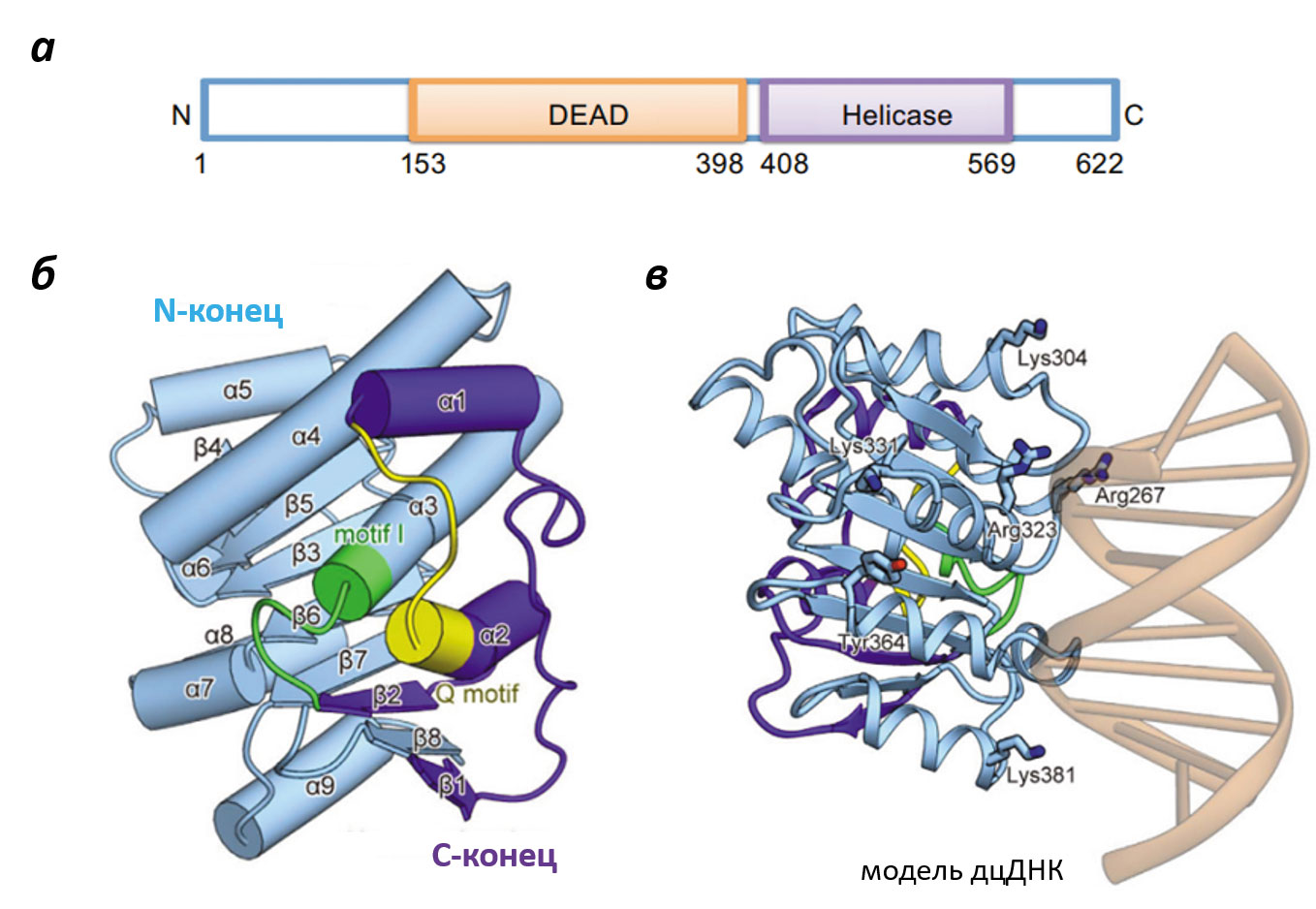 Рис. 7. Схема доменной организации DDX41 (а), модель структуры закрытой конформации DEAD-домена (б) и докинг модель комплекса DEAD-домена, связанного с дцДНК (в) (адаптировано из [85, 86], используется с разрешения издательства).