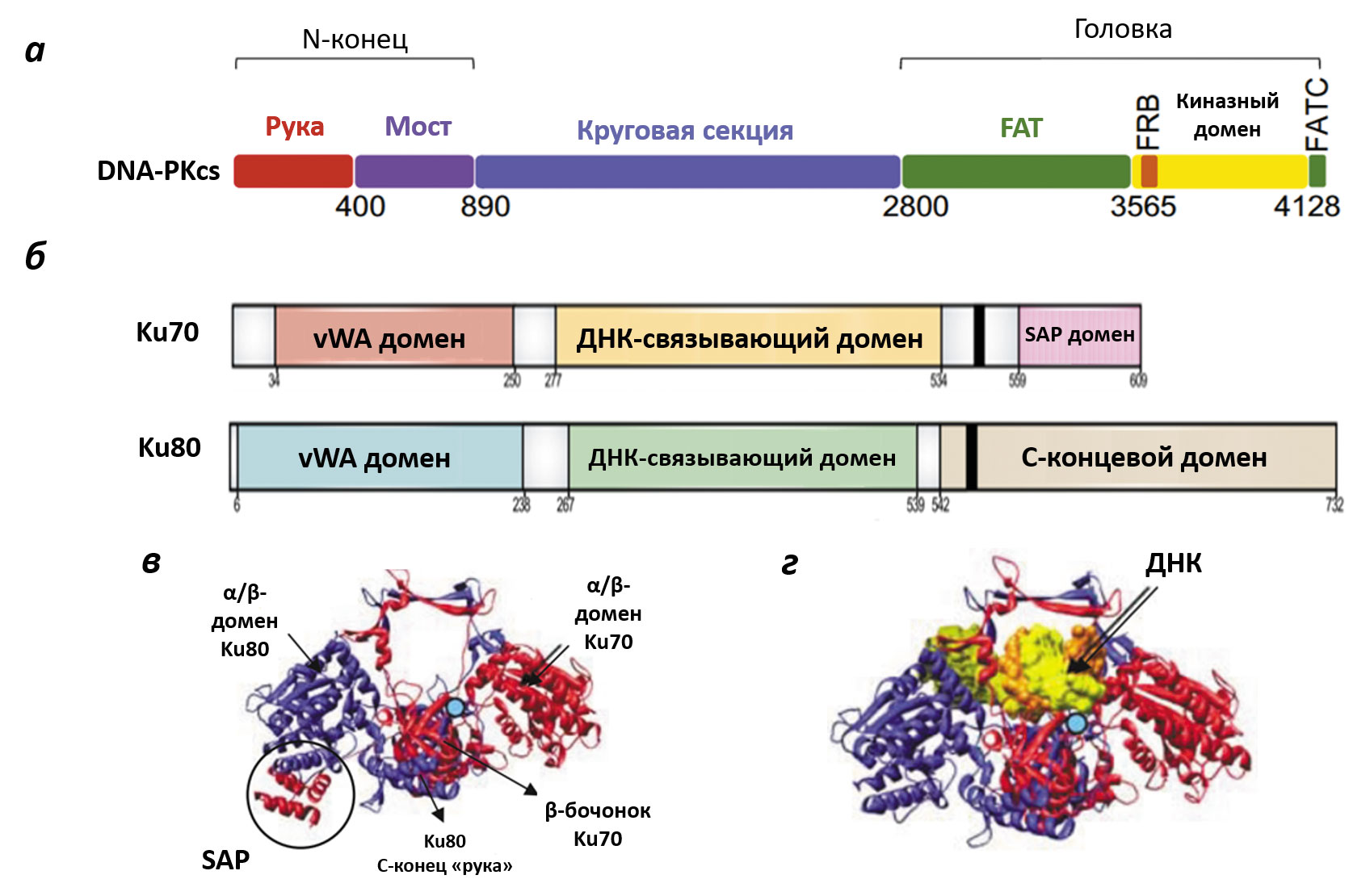 Субъединица DNA-PKcs состоит из нескольких доменов: N-концевого участка, включающего руку (красный цвет), мост (темно-фиолетовый цвет) и круговую секцию (сине-фиолетовый цвет); головки, включающей FAT (FRAP–ATM–TRRAP) (зеленый цвет), FRB (FKBP12-rapamycin-binding) (оранжевый цвет), киназный (желтый цвет) и FATC (FAT C-terminal) (темно-зеленый цвет) домены (рис. 8а). Сайты связывания с Ku-субъединицами располагаются в разных доменах на участках 102–210, 2178–2248 и 2374–2394 аминокислотной последовательности (а. п.). Участки 892–1289 и 1503–1538 а. п., расположенные в круговой секции, связывают ДНК [97]. Субъединицы Ku70 и Ku80 имеют схожую доменную структуру: N-концевой α/β-домен; центральный домен, состоящий из β-бочонков; и специфический C-концевой домен «рука», состоящий из спиралей (рис. 8б). N-концевой α/β-домен относится к семейству vWA (Willebrand factor A) доменов, включающих 6-цепочечные β-листы в складке Россмана, и участвует в ДНК репарации, но не принимает участие в прямом связывании ДНК, а также участвует в белок-белковых взаимодействиях. Центральный домен состоит из 7-цепочечных антипараллельных β-бочонков и участвует в связывании ДНК и гетеродимеризации. Связывание с ДНК не зависит от последовательности и имеет более высокую аффинность к дцДНК по сравнению к оцДНК. С-концевой домен участвует в узнавании ДНК и взаимодействии с DNA-PKcs и структурно различается у субъединиц Ku70 и Ku80. На С-конце субъединицы Ku70 присутствует ДНК-связывающий домен SAP (SAF-A/B, Acinus, and PIAS) (5 кДа). Предположительно этот домен стабилизирует взаимодействие Ku70 с ДНК [96] (рис. 8в). С-концевой домен субъединицы Ku80 (CTD) (19 кДа) вовлечен во взаимодействие с DNA-PKcs. Субъединицы Ku70 и Ku80 формируют гетеродимер, который совместно с третьей субъединицей DNA-PKcs образуют тройной комплекс, связывающий ДНК (рис. 8г, DNA-PKcs на рисунке не представлена). Аффинность связывания с ДНК падает в отсутствие гетеродимера Ku70/Ku80 [98].