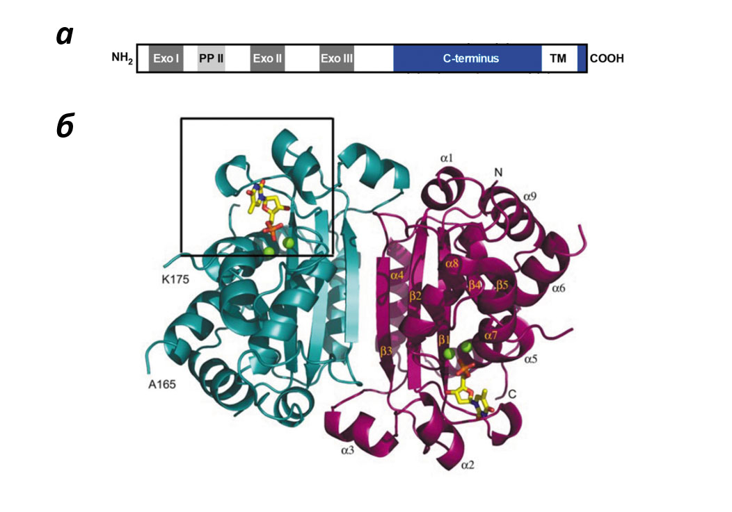 Рис. 10. Схема доменной организации TREX1 (а) и модель структуры гомодимера TREX1 (б) (адаптировано из [106, 107], используется с разрешения издательства). б — Мономеры TREX1 обозначены голубым и фиолетовым цветами. Черным квадратом выделена область активного центра, где связываются ионы магния (зеленые сферы) и нуклеотид dТМP (желто-оранжевая структура), а также происходит связывание оцДНК. В составе мономера присутствует неупорядоченная петля (166–174 а. о.), принимающая участие в связывании с дцДНК. Положение петли обозначено Ala165 и Lys175.