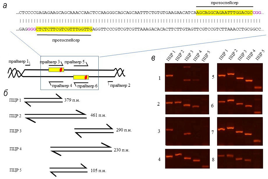 При использовании системы CRISPR/Cas9 и ее производных большинство мутаций возникают в сайтах двунитевых разрывов вблизи протоспейсеров. Для отбора моноклонов с мутациями мы использовали ПЦР с различными комбинациями праймеров, в том числе лежащих в области протоспейсоров: ПЦР1 — праймер 1 (IRBIT_For) и 4 (asF); ПЦР2 — праймер 1 (IRBIT_For) и 6 (sR); ПЦР3 — праймер 5 (asR) и 2 (IRBIT_Rev); ПЦР4 — праймер 3 (sF) и 2 (IRBIT_Rev); ПЦР5 — праймер 3 (asR) и 6 (sR) (рис. 5а, 5б). В немодифицированном целевом локусе все варианты комбинаций будут обеспечивать синтез ПЦР-продуктов (рис. 5в). В клонах с мутациями при использовании комбинаций с внутренними праймерами, которые могли отжигаться и на верхнюю, и на нижнюю цепь ДНК в участке редактирования ПЦР-продукты, соответствующие дикому типу, будут отсутствовать. Этот метод гораздо более точно отражает произошедшие события в месте внесенного двухцепочечного разрыва, и позволяет отслеживать внесение мутаций в областях двух разных протоспейсерных мотивов. Данный метод прост в исполнении и не требует затрат на дорогостоящие ферменты, по сравнению с другими методами оценки эффективности работы систем CRISPR/Cas9. Таким образом, данные праймеры могут амплифицировать только аллели дикого типа, но не мутантные аллели, и возникающая мутация в области 3’-конца праймеров нарушит амплификацию соответствующих фрагментов.