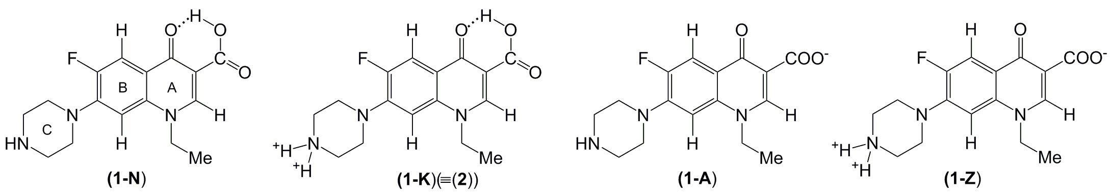 Норфлоксацин (Nf) в качестве биполярного зонда часто применяют в электрофизиологических исследованиях одиночных молекул. Помимо исходного соединения, так называемой основной (нейтральной) формы Nf, в наших экспериментах были использованы две солевые формы Nf: моно- и дигидрохлорид (Nf·HCl и Nf·2HCl). Поскольку зарядовое состояние и, соответственно, растворимость основной формы норфлоксацина зависят от рН среды, особое внимание было уделено характеристике теоретически возможных форм молекулы этого антибиотика в водной среде.