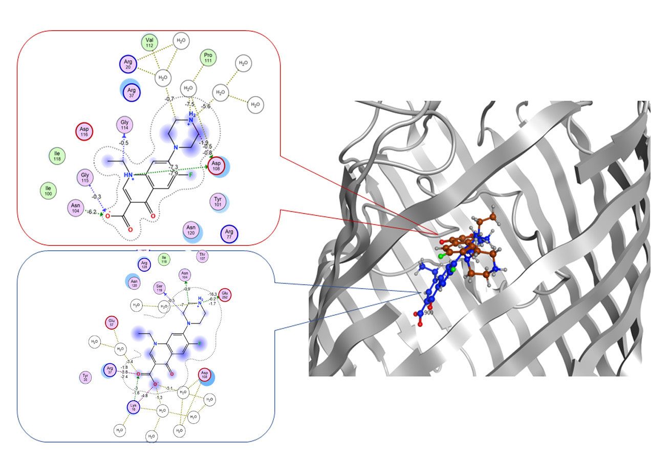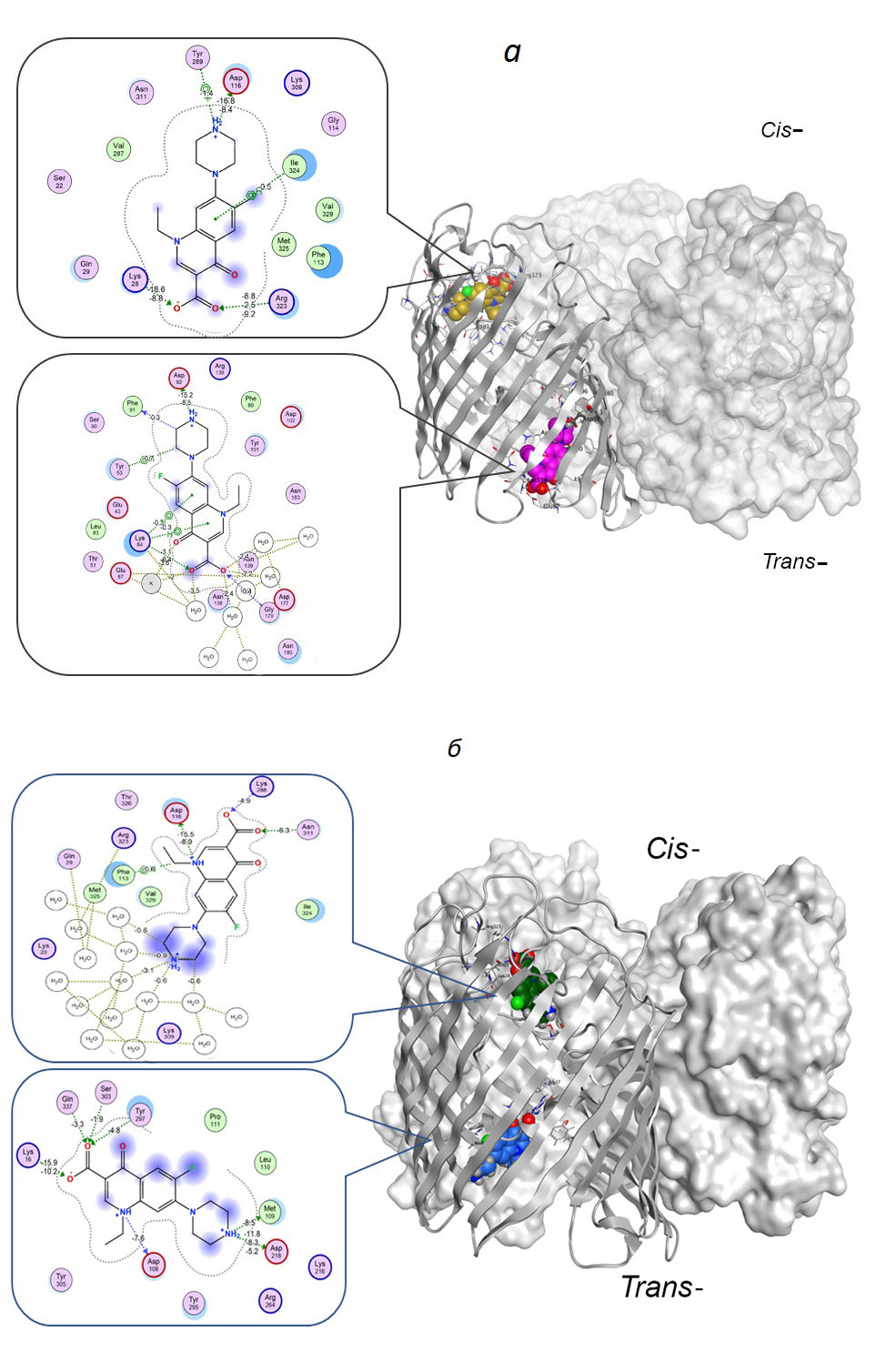 Полученные нами данные согласуются с результатами исследования взаимодействия энрофлоксацина (EF) с OmpF порином E. сoli (EcOmpF), для которого было показано наличие двух сайтов связывания антибиотика выше и ниже ЗК [21]. Однако Mahendran и соавторы полагают, что EF в центрах связывания стабилизирован преимущественно благодаря гидрофобным взаимодействиям с остатками Met38 и консервативным Phe118, а также водородными связями с Arg132, Arg 82 и Tyr32 [21].