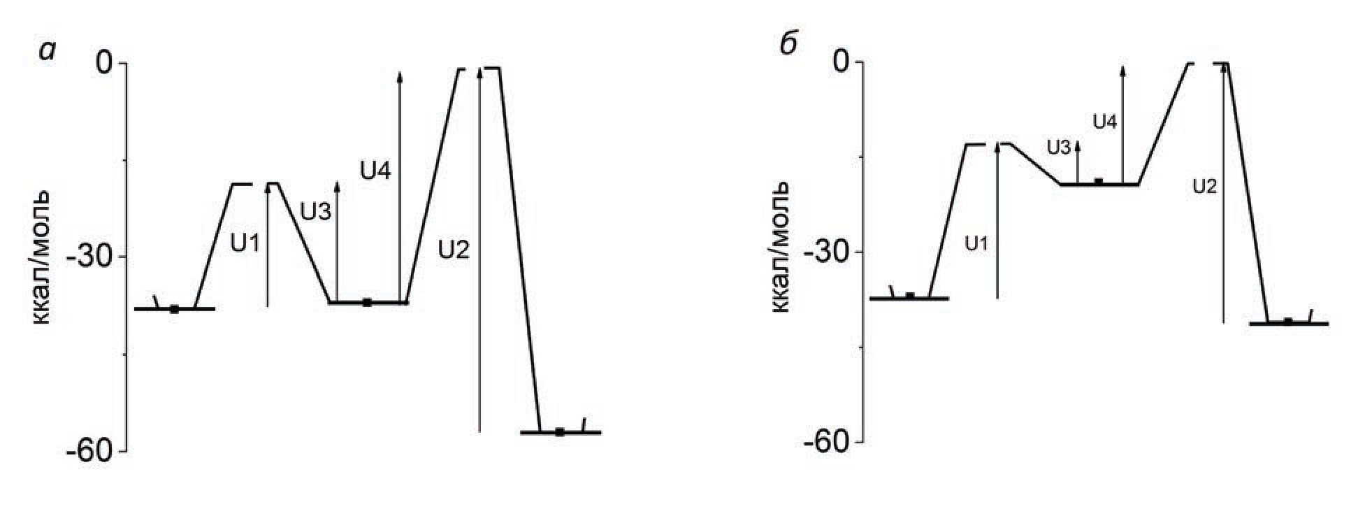 Совокупность полученных нами данных, экспериментальных и теоретических, свидетельствуют об асимметричной структуре канала YpOmpF. Они также дают представление о кинетике процесса взаимодействия антибиотика с каналом YpOmpF и ступенчатом характере преодоления его заряженной молекулой нескольких энергетических барьеров: двух, обусловленных взаимодействием с энергетически выгодными периферийными сайтами по обе стороны канала (U1 и U2 ), и двух (U3 и U4) — в ЗК, где происходит блокировка тока (рис. 8). Как видно из данных рис. 8, наблюдаемая нами асимметрия в Kon при введении заряженных молекул Nf с разных сторон мембраны свидетельствует о существенной разнице в энергетических барьерах, необходимых для проникновения антибиотика в сайт блокировки (U1<U2).
