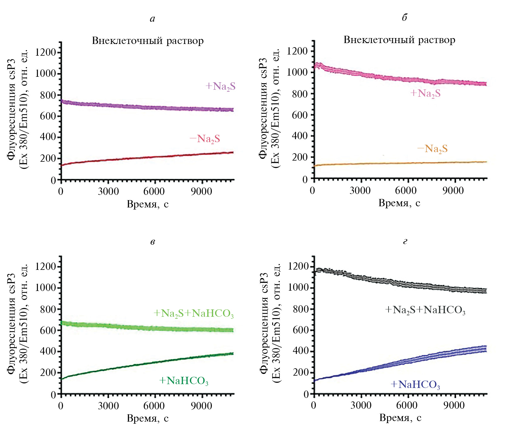 Оказалось, что в растворе, приближенном по солевому составу к внутриклеточному, добавление Na₂S к P3 (рис. 4в) увеличивает флуоресценцию сильнее, чем в растворе, соответствующем внеклеточному раствору (рис. 4а). При этом со временем флуоресценция csP3 медленно снижалась. Добавление бикарбоната до концентрации, которая близка к физиологической снаружи и внутри клеток (10 мM NaHCO₃) [26], медленно увеличивало флуоресценцию в обоих растворах в отсутствие Na₂S (рис. 4б, 4г). Наличие бикарбоната практически не влияло на сигнал csP3 в присутствии Na₂S в обоих растворах (рис. 4б, 4г). Плавный рост флуоресценции в лунках, не имевших Na₂S, но содержавших NaHCO₃, обусловлен, возможно, абсорбцией газообразного H₂S, образовавшегося в соседних лунках, в которые добавляли Na₂S.