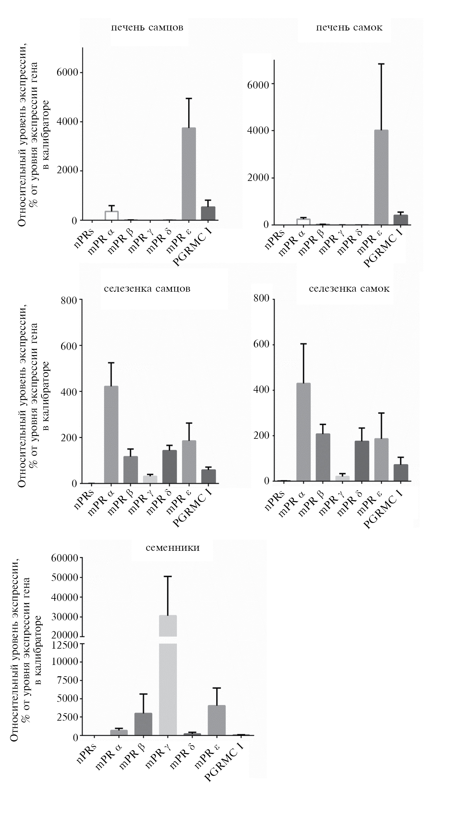 Рис. 8. Уровень экспрессии мРНК mPRs и PGRMC I в печени и селезенке самок и самцов (n = 3) и в семенниках крыс Wistar (n = 5). Данные представлены в виде среднее ± стандартное отклонение.