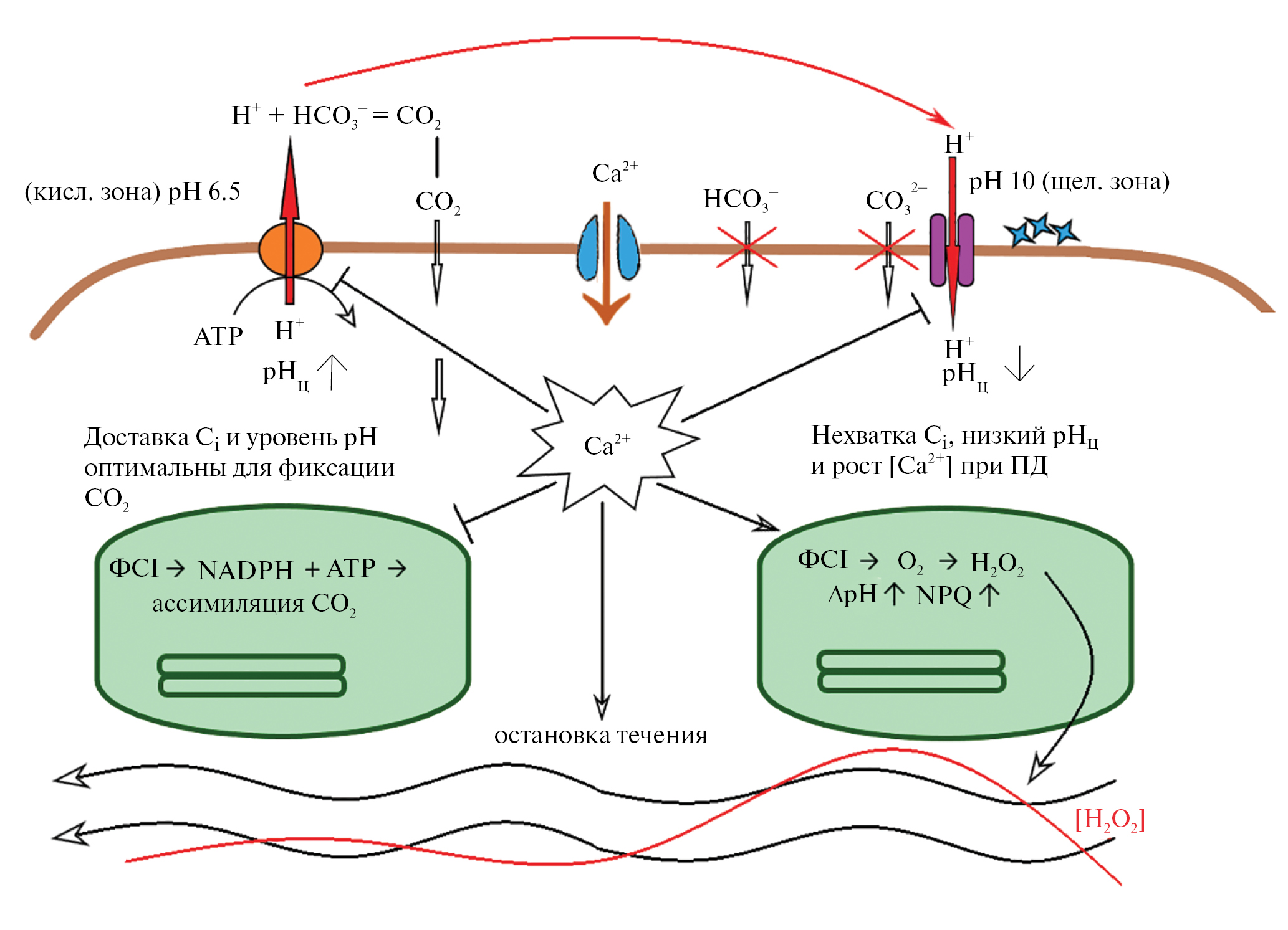 Рис. 5. Функциональные отличия «кислых» и «щелочных» зон интернодальных клеток Chara в покое и после генерации ПД на плазматической мембране. В кислых зонах на свету работает ATP-зависимый Н+-насос, что смещает рНо в слабокислую область и способствует преобразованию непроникающего аниона НСО3– в нейтральную проникающую форму СО2. Выведение протонов Н+-насосом поддерживает слабощелочной рН цитоплазмы (рНц), способствующий фиксации СО2. Дуговая стрелка в периплазматическом пространстве изображает протекание электрического тока на внеклеточном сегменте круговой цепи. Для щелочных зон клетки характерны высокая Н+-проводимость плазмалеммы, необходимая для поддержания суммарного баланса Н+ в цитоплазме, отсутствие проникающей формы углерода СО2, осаждение кристаллов СаСО3 и сравнительно низкие значения рНц. Из-за нехватки СО2 и пониженного рНц фотосинтетический поток электронов частично переключен с ассимилирующего пути на восстановление О2 с образованием Н2О2, который действует как акцептор реакции Хилла, вызывая нефотохимическое тушение (NPQ) флуоресценции хлорофилла. Накопление Н2О2 в хлоропластах сопровождается его выведением в текущую цитоплазму и распространением Н2О2 с потоком по длине клетки. Резкое возрастание [Ca2+]ц при возбуждении вызывает подавление Н+-насоса и Н+-проводимости, что проявляется в сглаживании щелочных пиков, возрастании сопротивления мембраны в области щелочных зон и в переходной гиперполяризации клетки. Повышение [Ca2+]ц во время ПД стимулирует фотовосстановление О2 и образование Н2О2 в участках с пониженным рНц, а также вызывает остановку течения цитоплазмы. Оба фактора усиливают неравномерное распределение АФК (Н2О2) по длине клетки и отвечают за появление длительных осцилляций эффективного квантового выхода YII и максимальной флуоресценции Fm′ как показателя нефотохимического тушения (NPQ) при наблюдении на микроучастках клетки.