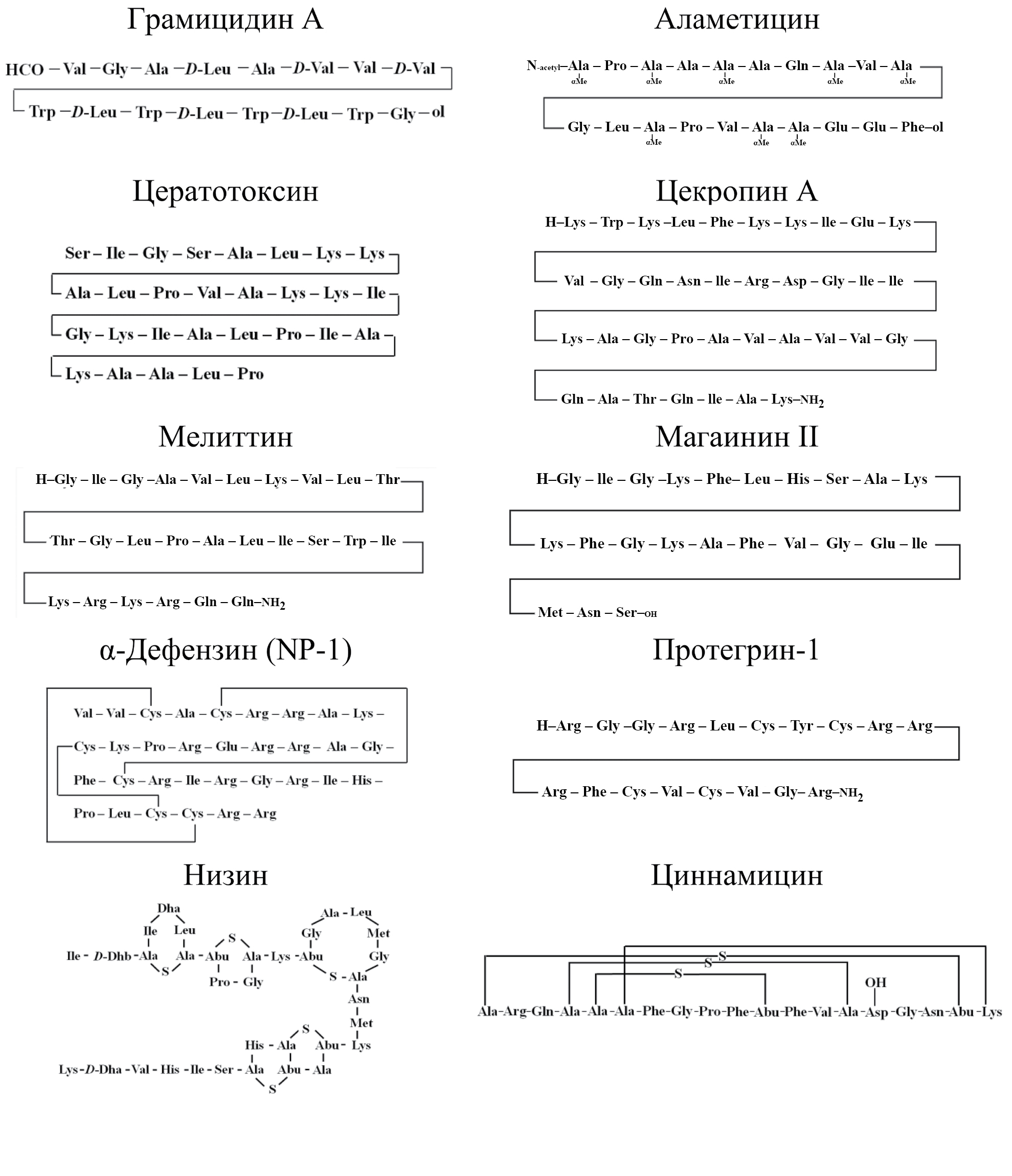 Рис. 2. Химические структуры порообразующих антимикробных пептидов: грамицидина А, аламетицина, цератотоксина, цекропина А, мелиттина, магаинина II, α-дефензина NP-1, протегрина-1, низина и циннамицина. Указаны только D-энантиомеры аминокислот. α-Me-Ala – α-метилаланил; Phe-ol – фенилаланинол; Dhа – дегидроаланин; Dhb – дегидробутирин; Abu – α-аминомасляная кислота.