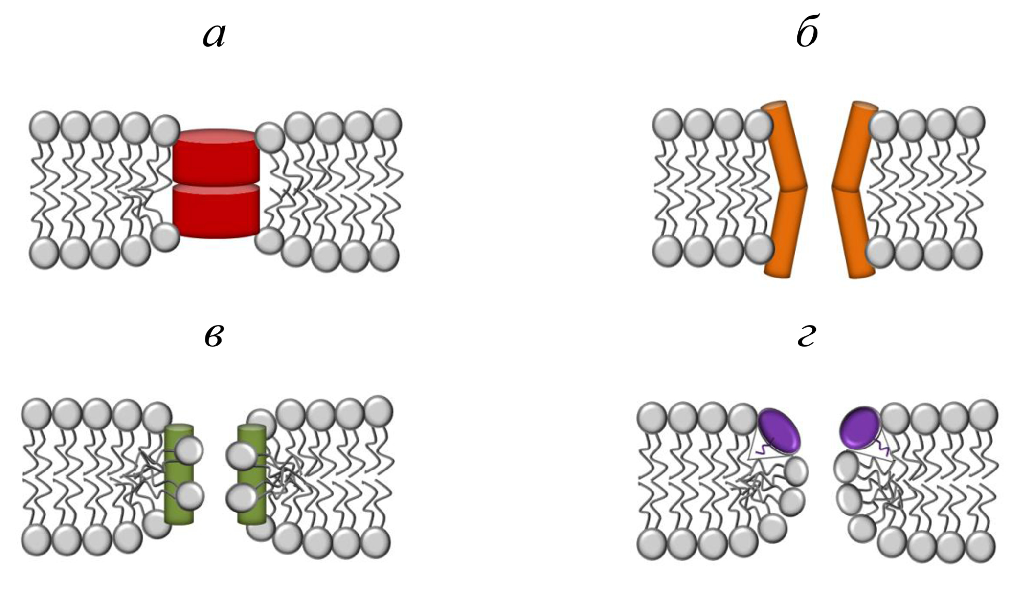 Рис. 3. Различные модели формирования ионных каналов антимикробными пептидами: путем димеризации спиралей грамицидина А (а); ассоциации α-спиралей аламетицина в пептидный «бочонок» (б); формирования пептид-липидной тороидальной поры мелиттином (в) и образования асимметричной липопептид-липидной поры сирингомицином Е (г).