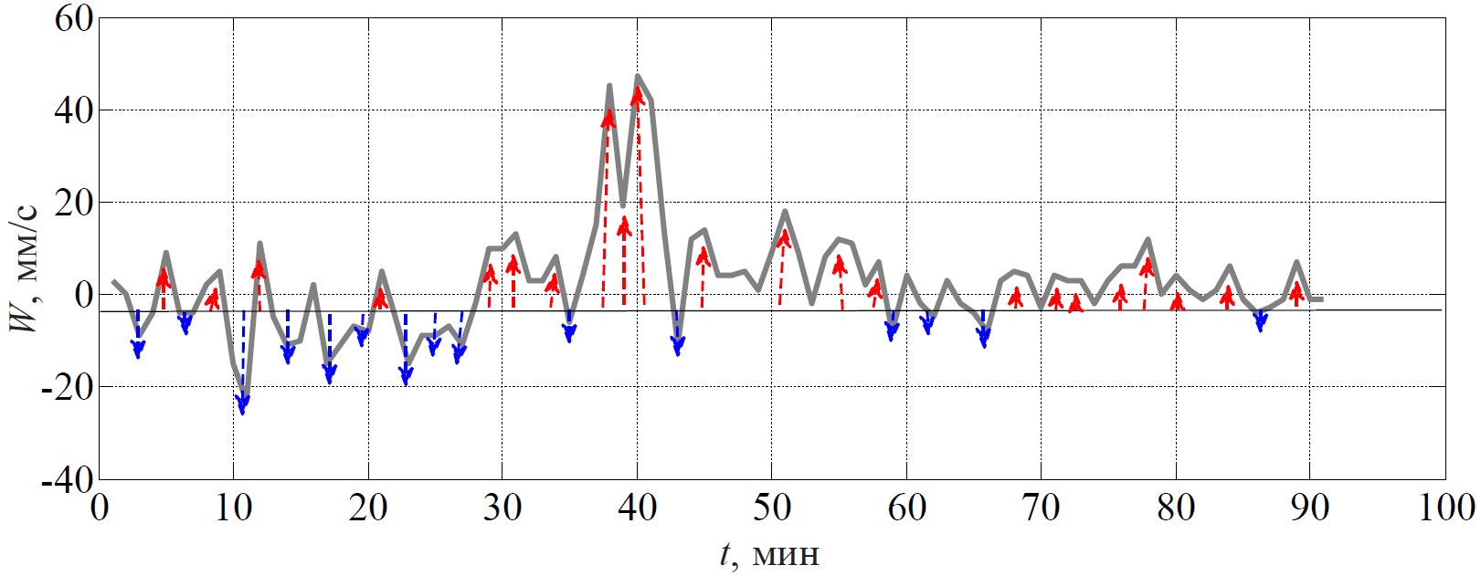 Fig. 2. Convergence and divergence zones on the record of vertical velocity component at the 2.5 m horizon during 90 min. Red and blue arrows indicate the local velocity maxima in the upward and downward flows