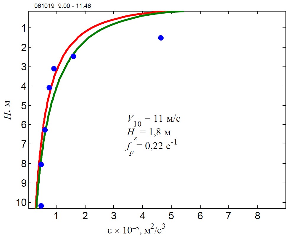 На рис. 4 приведены результаты расчетов по усовершенствованной многомасштабной модели для конкретного случая. Из рисунка видно, что учет влияния стоксова дрейфа на скорость диссипации изменяет вид зависимости. Расчеты с реальными входными параметрами, полученными в измерениях (скорость ветра, высота и частота спектрального пика волнения), показывают, что этот механизм добавляет к суммарной по 30-метровому слою скорости диссипации турбулентной энергии от 2 до 17 %.
