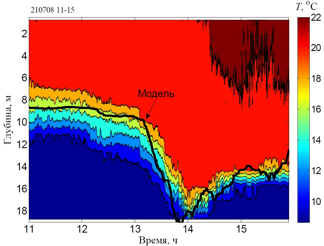 Результаты расчетов по натурным гидрометеорологическим данным показывают, что модель Крауса – Тернера, дополненная соотношениями из многомасштабной модели, вполне удовлетворительно соответствует фактическому изменению толщины верхнего пограничного слоя. Коэффициент корреляции модельных расчетов эволюции профиля температуры с натурными данными в большинстве случаев был в пределах 0,7–0,9. Расхождение наблюдений с модельными расчетами, кроме несовершенства модели, может быть вызвано влиянием неучтенных факторов, влияющих на вертикальный обмен. К этим факторам можно отнести как локальные течения (циклонические и антициклонические), возникающие в прибрежной зоне, так и процессы апвеллинга/даунвеллинга и конвекцию.