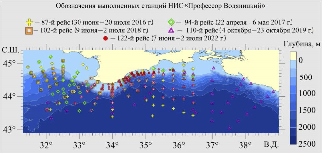 В настоящей работе были использованы результаты гидрологических измерений и данные о микроструктурных профилях гидрофизических полей, полученные в 87, 94, 102, 110 и 122-м рейсах НИС «Профессор Водяницкий» за 2016–2022 гг. Расположение выполненных станций показано на рис. 7, работы по сбору данных о микроструктуре гидрофизических полей были проведены сотрудниками отдела турбулентности. Сбор информации осуществлялся в северной части Черного моря в пределах экономической зоны России с целью определения характеристик вертикального турбулентного перемешивания и фоновых характеристик среды в исследуемом регионе. В 122-м рейсе благодаря новому микроструктурному зонду была впервые получена информация не только о пульсационных характеристиках скорости и температуры, но и о вертикальном распределении содержащегося в воде кислорода, хлорофилла а и о мутности вплоть до глубин более 900 м. В целом анализируемые данные охватывают периоды весна – лето – осень, что позволяет сделать определенные статистические выводы. Исследования в данном регионе предусматривали получение зависимостей коэффициента вертикальной турбулентной диффузии K от частоты плавучести N и от глубины z по пульсационным характеристикам потока и сравнение их с гидрологическими данными на соответствующих станциях, а также общий анализ гидрофизических особенностей исследуемых участков и их окрестностей.