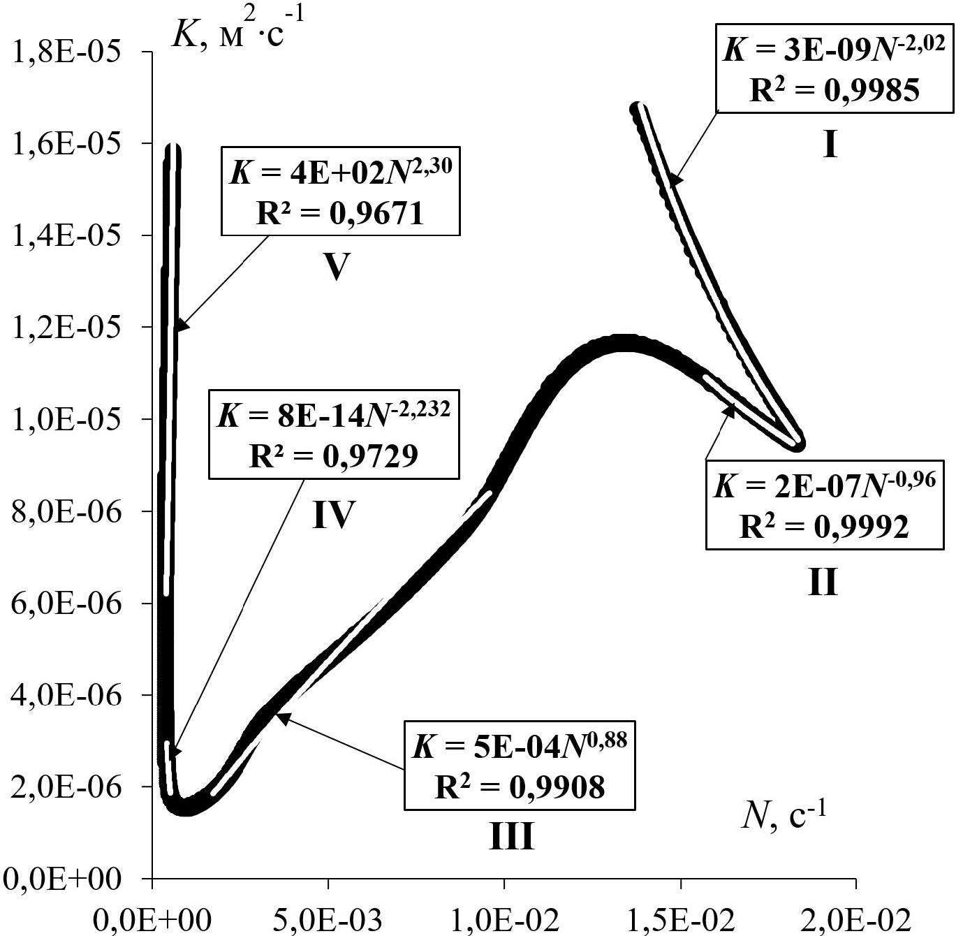 Рис. 9. Зависимость коэффициента вертикальной турбулентной диффузии K от частоты плавучести N в стратифицированных слоях интервала глубин 50–1750 м для глубоководной части Черного моря [21]
