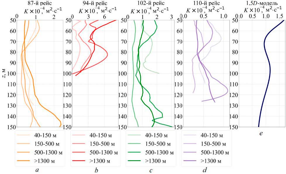 Как видно из графиков, по мере отдаления от шельфовой зоны и увеличения глубины местонахождения станции, происходит трансформация профиля, который повторяет модельное распределение K с его характерными точками перегиба, но с бо́льшими значениями коэффициента. Особенно хорошо это видно на примере 94-го рейса, данные в котором были собраны преимущественно в северо-западной части исследуемого региона и в районе резкого свала глубин вблизи прикерченского участка шельфа. С увеличением числа станций, выполненных в отдалении от шельфового склона и над глубоководной частью Черного моря (87, 102, 110-й рейсы), изменение K с глубиной приближается к модельному диапазону значений – порядка 10−5 м2×с−1. Это свидетельствует о снижении влияния наклонного дна с увеличением глубины на общую картину турбулентного перемешивания в диапазонах глубин 500 м и более, что подтверждает значительное влияние на обменные процессы в верхних стратифицированных слоях Черного моря эффектов, описанных в [11].
