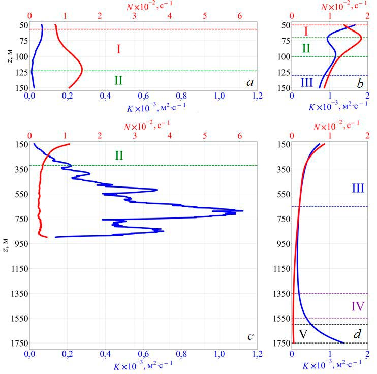 На рис. 11 приведено сравнение модельного распределения K(z), N(z) и результатов измерений, полученных в 122-м рейсе НИС «Профессор Водяницкий». На верхней оси графиков отложены значения частоты плавучести (красная кривая), на нижней – K (синяя кривая). Рассчитанные по измеренным комплексом MSS90L параметрам среды (рис. 11, a, c), значения коэффициента в данном случае на два порядка выше, чем полученные в результате 1,5D-моделирования значения (рис. 11, b, d). Расчетные величины были получены с дискретностью по глубине 2 м и усреднялись по всем станциям для соответствующих диапазонов глубин с последующим применением фильтра Савицкого – Голея с целью выделения основной тенденции изменения этих величин с глубиной.