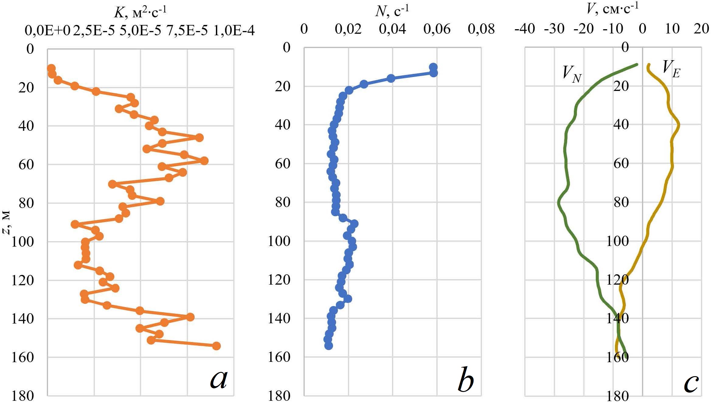 Рис. 12. Распределение K (a), N (b) и скорости течений (c) с глубиной по результатам расчета и данным измерений ADCP на ст. 10 87-го рейса НИС «Профессор Водяницкий». VE и VN – зональная и меридиональная составляющие скорости течения соответственно