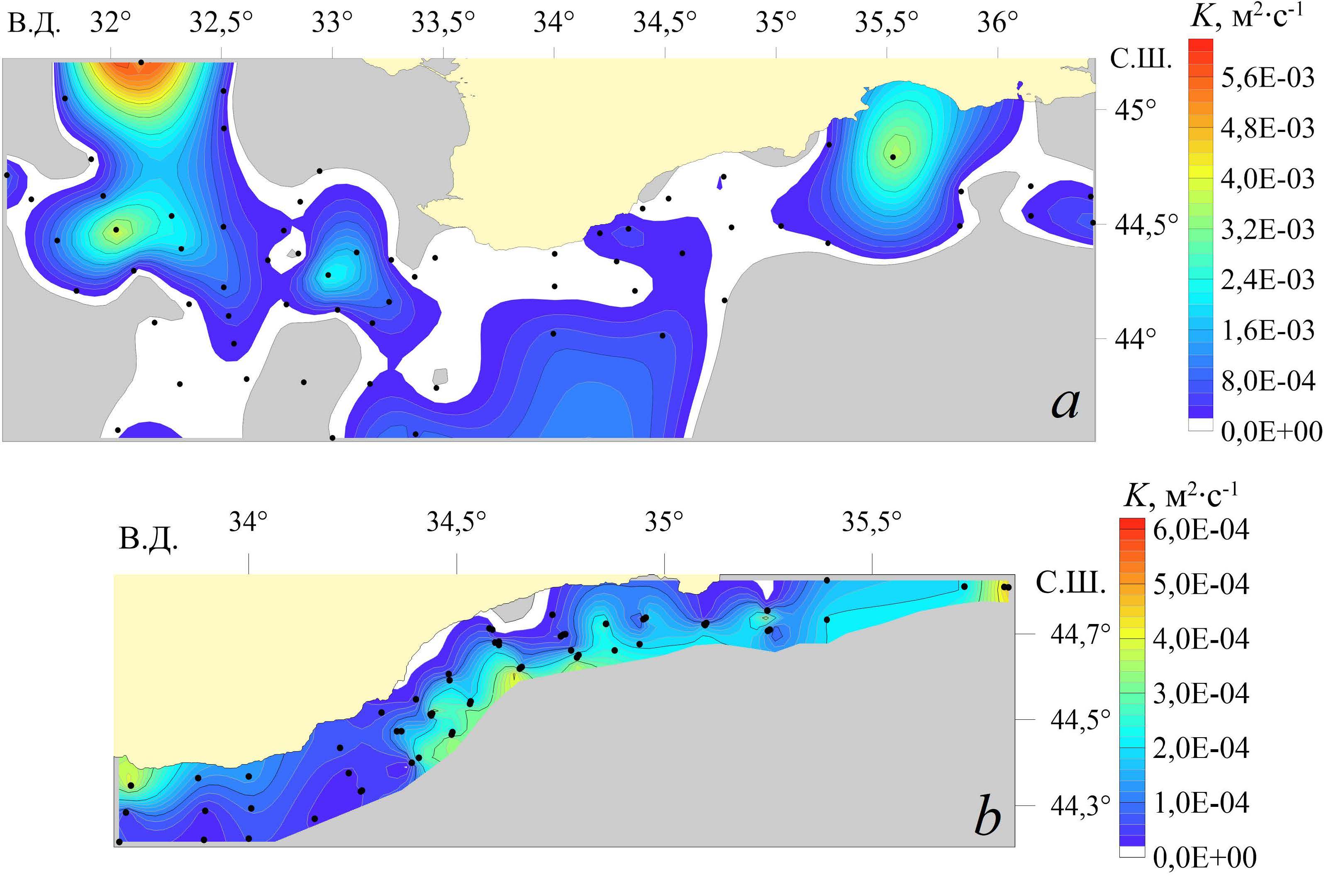 Fig. 13. Average values of K at the stations of the 94th (a) and 122nd (b) cruises of the R/V Professor Vodyanitsky. Dots indicate the performed stations