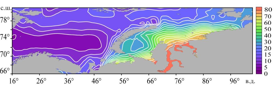 В холодные месяцы года устойчивость вод в Баренцевом море мала или близка к нестабильному состоянию [5, 21]. Критерием вертикальной устойчивости слоев в море служит значение градиента плотности по вертикали с учетом поправки на адиабатический процесс [21]. При глубинах до ~ 1000 м этой поправкой можно пренебречь в силу ее малости, а вместо градиента плотности рассматривать частоту плавучести. Географическое распределение Nmax(z) и HNmax(z) в Баренцевом и Карском морях в июле показано на рис. 1, 2. Можно видеть, что в июле воды с максимальной устойчивостью располагаются в прибрежных районах: в районе дельты р. Печора (Печорское море, ~50 цикл/ч), побережья п-ова Ямал, в приустьевых районах Оби и Енисея (~ 60–70 цикл/ч). Центральная часть Баренцева моря занята водами с малыми значениями Nmax(z) (˂ 7 цикл/ч). На север от 75-й параллели максимум частоты плавучести повышается до 10–15 цикл/ч. В центральной части Карского моря с 75° по 80° с. ш. значения Nmax(z) составляют ~ 20 цикл/ч, южнее – ~ 80 цикл/ч, в юго-западной части Карского моря 30–50 цикл/ч. Высокая устойчивость в юго-восточной части Баренцева и южной части Карского морей обусловлена притоком пресных материковых вод, повышающим градиент солености в прибрежной зоне. Поверхностный прогрев также создает в это время года температурный градиент, но его влияние на устойчивость по сравнению с градиентом солености менее значительно [5, 22]. Относительно высокая устойчивость вод в Баренцевом море в июле севернее 75° с. ш. обусловлена увеличением градиента солености вследствие таяния льда. Низкая устойчивость в центральной части (изолиния Nmax(z) ~ 7 цикл/ч) вызвана присутствием атлантических вод (Нордкапское течение), имеющих высокую соленость и температуру (рис. 1). При своем движении на восток эти воды перемешиваются с водами Баренцева моря, охлаждаются и опускаются с поверхности до слоя, имеющего бóльшую плотность. Это приводит не только к уменьшению устойчивости вод, но и, как следствие, к заглублению максимума частоты Вяйсяля – Брента до 40 м (рис. 2) [21]. Небольшие значения максимума частоты плавучести в центре восточной части Карского моря в июле, вероятнее всего, обусловлены медленным продвижением распресненных прибрежных вод на север.