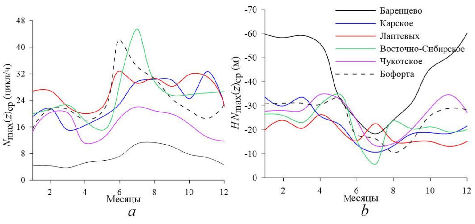 Для характеристики внутригодовой изменчивости устойчивости вод в арктических морях для каждого месяца рассчитывались средние значения максимума частоты Вяйсяля – Брента (Nmax(z)ср) (рис. 3, а) и средние глубины их залегания (HNmax(z)ср) (рис. 3, b). Средние значения получены как средние арифметические значения по всей акватории моря. Видно, что в Баренцевом море максимальная устойчивость наступает в июле – августе, а в Карском море – в августе – сентябре и ноябре. В октябре в Карском море с началом процесса ледообразования устойчивость понижается. В ноябре с образованием ледового покрова речные воды начинают распространяться в подледных горизонтах, что ведет к увеличению устойчивости [5, 22]. В теплое время года слой скачка плотности поднимается к поверхности, а зимой заглубляется. В Баренцевом море летом средняя глубина залегания пикноклина составляет ~ 24 м, зимой – ~ 60 м, в Карском море летом – ~ 14 м, зимой – ~ 35 м (рис. 3, а, b).