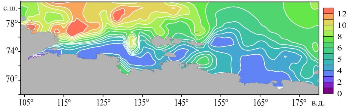 Рис. 11. Среднемноголетнее распределение максимума амплитуды вертикальной составляющей скорости первой моды ВВ (в условных единицах) в морях Лаптевых и Восточно-Сибирском в июле, λ = 1000 м