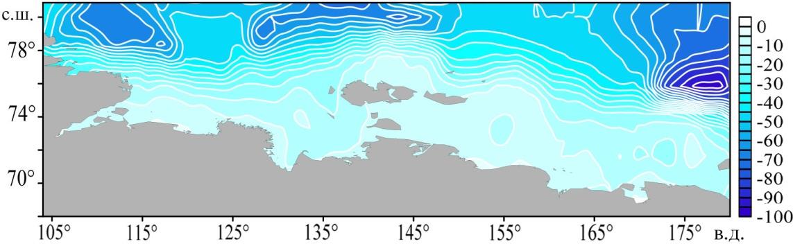 Рис. 12. Среднемноголетнее распределение глубины залегания максимума амплитуды вертикальной составляющей скорости первой моды ВВ (м) в морях Лаптевых и Восточно-Сибирском в июле, λ = 1000 м