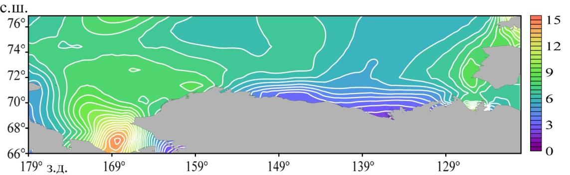 Рис. 13. Среднемноголетнее распределение максимума амплитуды вертикальной составляющей скорости первой моды ВВ (в условных единицах) в морях Чукотском и Бофорта в июле, λ = 1000 м