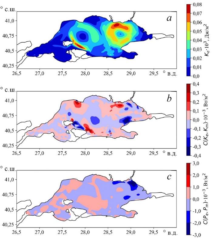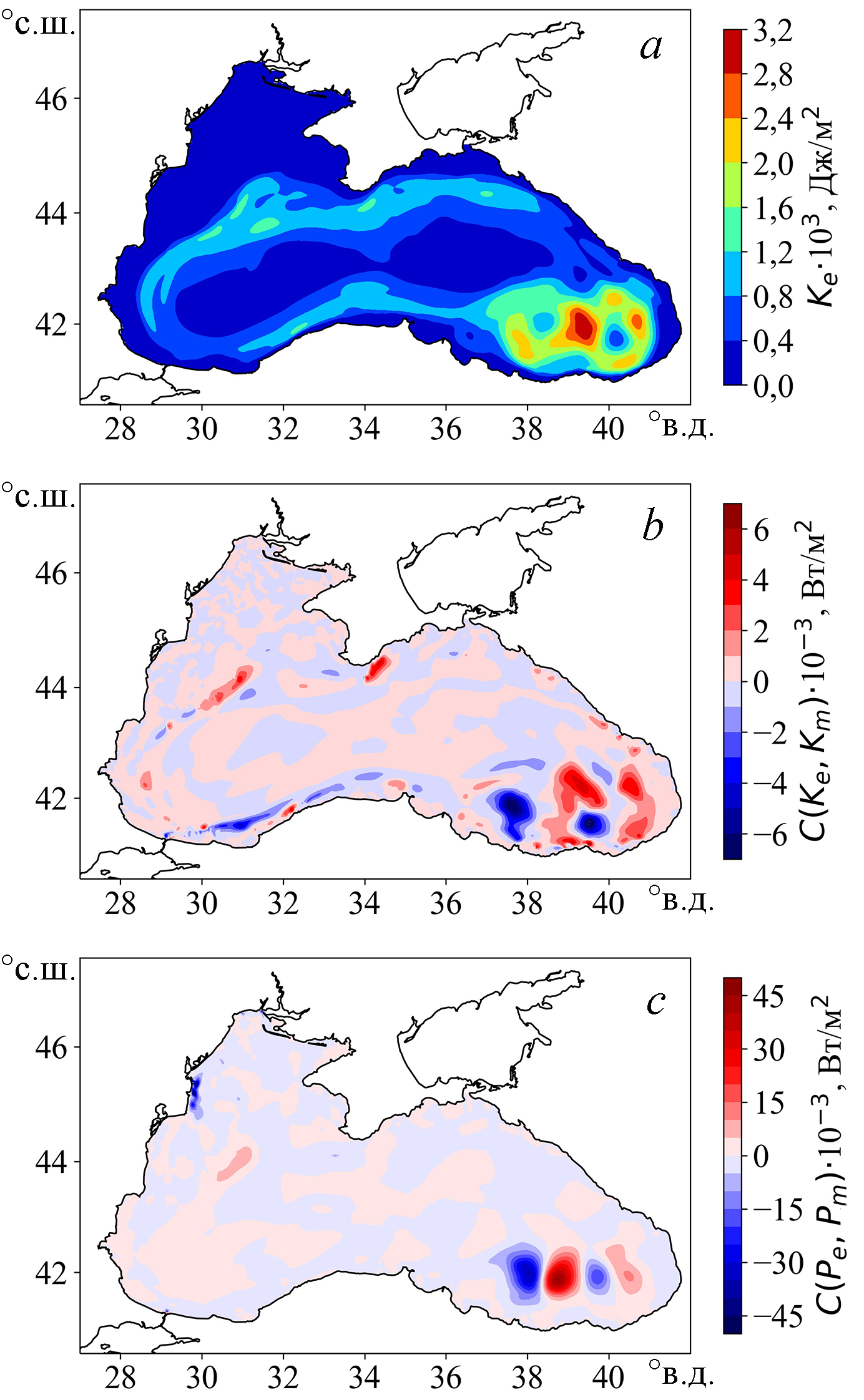 На рис. 4 представлены пространственные распределения проинтегрированных по вертикали величин Ke, C(Ke, Km) и C(Pe, Pm). Как видно, максимальная вихревая КЭ локализована в зоне стационирования Батумского антициклона (юго-восточный угол моря на рис. 4, a). Здесь же наблюдается область наиболее интенсивного энергообмена вследствие процессов баротропной (рис. 4, b) и бароклинной (рис. 4, c) неустойчивости. При этом экстремальные значения параметра C(Pe, Pm) примерно в семь раз больше, чем C(Ke, Km).