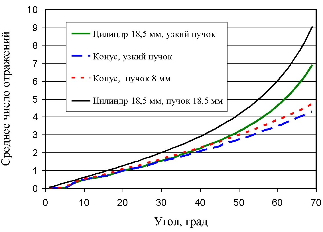 Для демонстрации преимуществ использования конусной кюветы по сравнению с методами измерения поглощения, использующими цилиндрическую кювету [10–14], проведены расчеты по упрощенному алгоритму. В этом случае преломленные лучи не учитываются, а расчеты сводятся к определению точки пересечения луча с границами конуса, а также к вычислению направления отраженного луча (формулы (1) – (7)). Поскольку коэффициент отражения Френеля, начиная с угла полного внутреннего отражения , резко уменьшается, то фактический выигрыш по сохраненной энергии оценивается через интеграл индикатрисы от угла до . Как показывают расчеты, основное преимущество способа измерения поглощения света с использованием конической кюветы состоит в уменьшении количества отражений и уменьшении вариации длины пути в зависимости от угла рассеяния. Расчеты проведены для следующих параметров: длина конуса , угол раствора , радиус окружности пучка света равен минимальному радиусу конуса мм. Наиболее простой случай центрального луча не требует интегрирования по двум переменным. Также проводились расчеты для цилиндрической кюветы (частный случай конуса с нулевым углом раствора) с радиусами 4 и 9,25 мм.