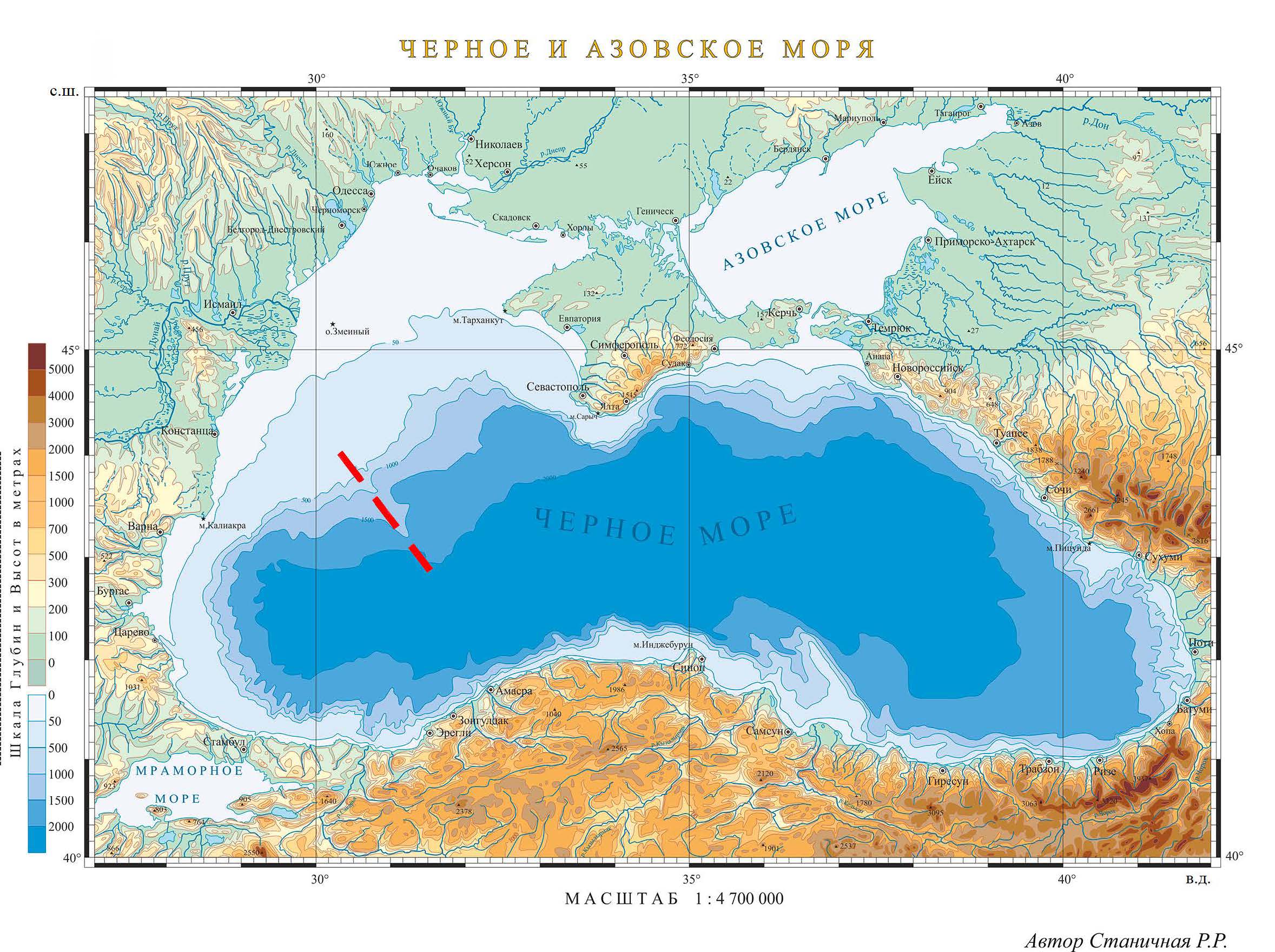 Р и с. 1. Топография Черноморско-Азовского бассейна (карта составлена Р. Р. Станичной). Красной штриховой линией обозначено местоположение вдольсклонового хребта в западной части черноморского континентального склона