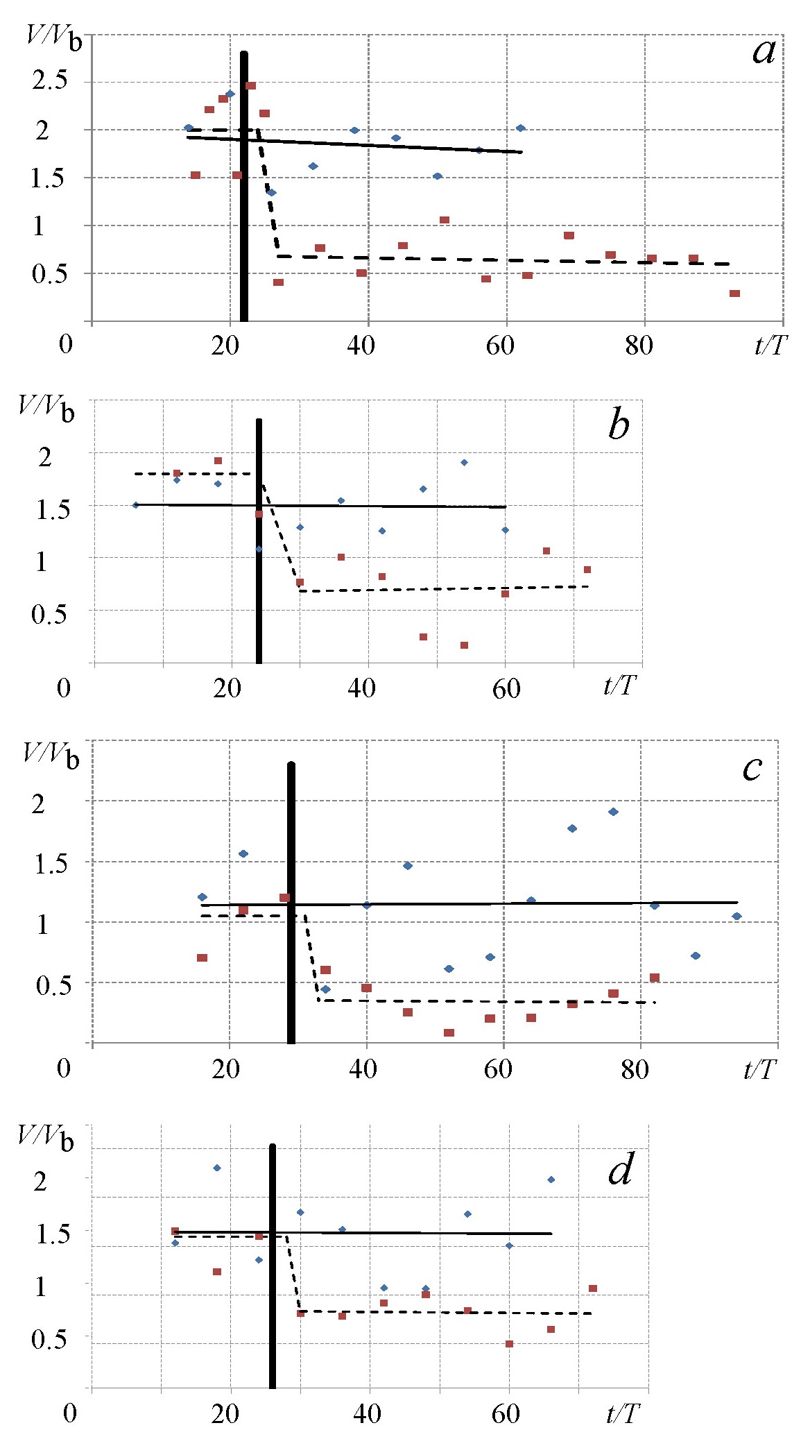 Р и с. 4. Зависимость от t⁄T в эксперименте с однородной пресной жидкостью (a); с жидкостью соленостью S, равной 1 (b), 2 (c), 4 ‰ (d). Синие ромбы – эксперимент над конусом с гладкой поверхностью, красные квадраты – эксперимент над конусом с выступом в виде хребта, толстая черная линия – момент времени, когда фронт течения пересекает хребет, тонкая сплошная линия – линия тренда для опытов над конусом с гладкой поверхностью, тонкая штриховая линия – линия тренда для опытов над конусом с хребтом 3