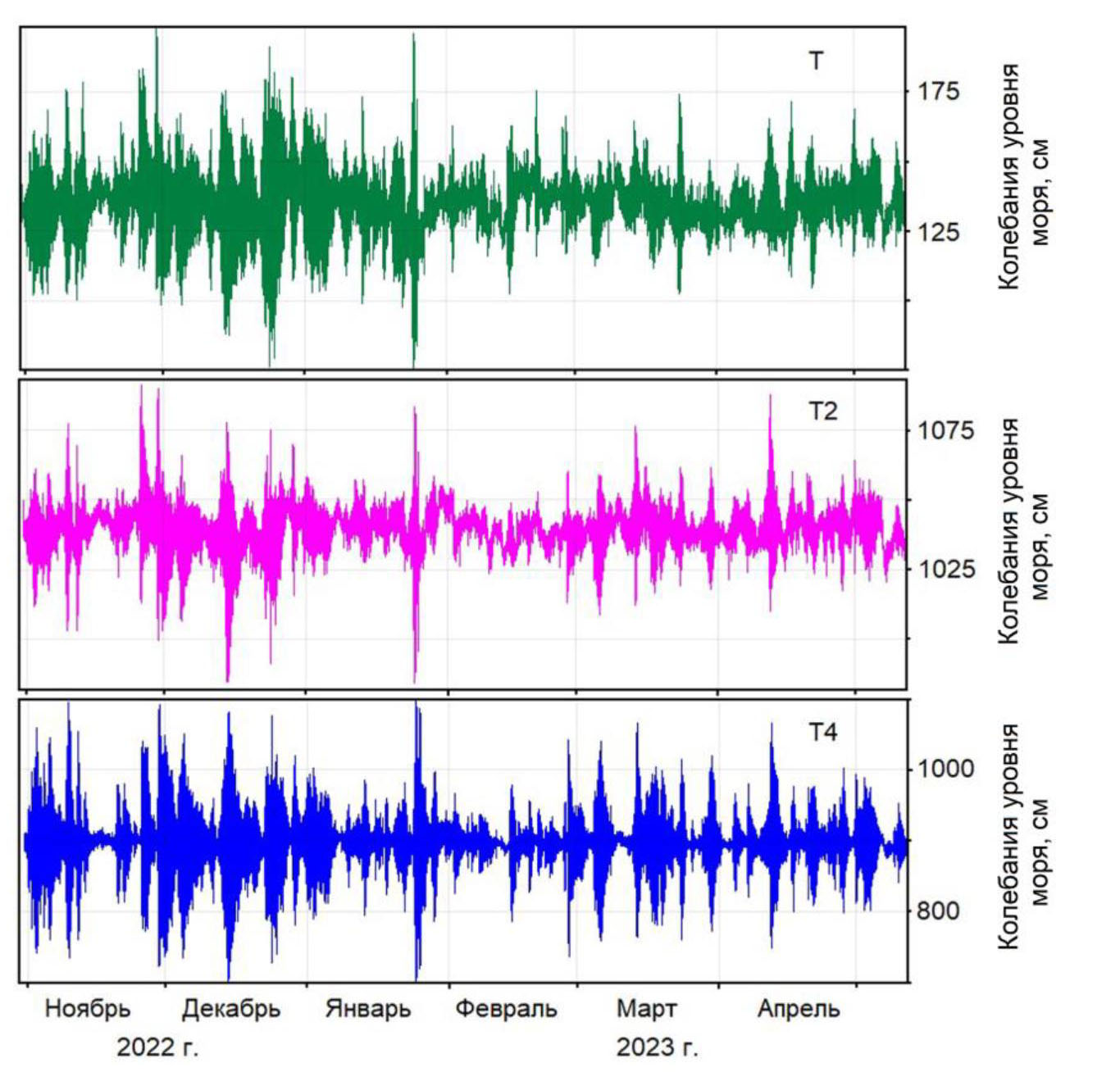 Наблюдения уровня моря. Наблюдения колебаний уровня моря проводились с сентября 2022 г. по май 2023 г. с использованием трех автономных измерителей волнения АРВ-14 К: измерителя Т (заводской номер 152), измерителя Т2 (заводской номер 142) и измерителя Т4 (заводской номер 149) (рис. 1). Был установлен еще и четвертый прибор в море на изобате 4 м напротив входа в бухту Холмск-Северный, но он оказался неисправным. Точность измерения придонного гидростатического давления, которое впоследствии пересчитывалось в колебания уровня моря с учетом затухания коротких волн с глубиной, составляет 0,06% от верхнего предела измерения, а разрешающая способность по давлению равна ±0,0003% также от верхнего предела измерения. Дискретность измерений уровня и температуры составляет 1 с.