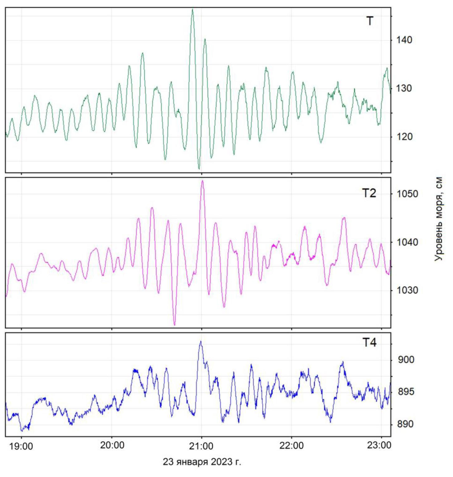 На рис. 5 приведен временной ход колебаний уровня моря без учета предвычисленного прилива в двух бухтах и в открытом море за 23 января 2023 г. Хорошо видно значительное увеличение амплитуд колебаний уровня с близкими частотами в бухтах с 20:00 до 22:00. Для открытого моря увеличение амплитуд колебаний в 1,5–2 раза меньше. При этом колебания уровня в 21:00 в бухте Холмск-Северный (измеритель Т2) и в открытом море (измеритель Т4) почти совпадают по фазе, а в бухте Торгового порта (измеритель Т) находятся в противофазе с ними. Отметим, что такие синхронные увеличения амплитуд наблюдаются достаточно часто, при этом имеют место случаи, когда колебания с максимальными амплитудами в бухтах совпадают по фазе (напр., 11 марта 2023 г.).