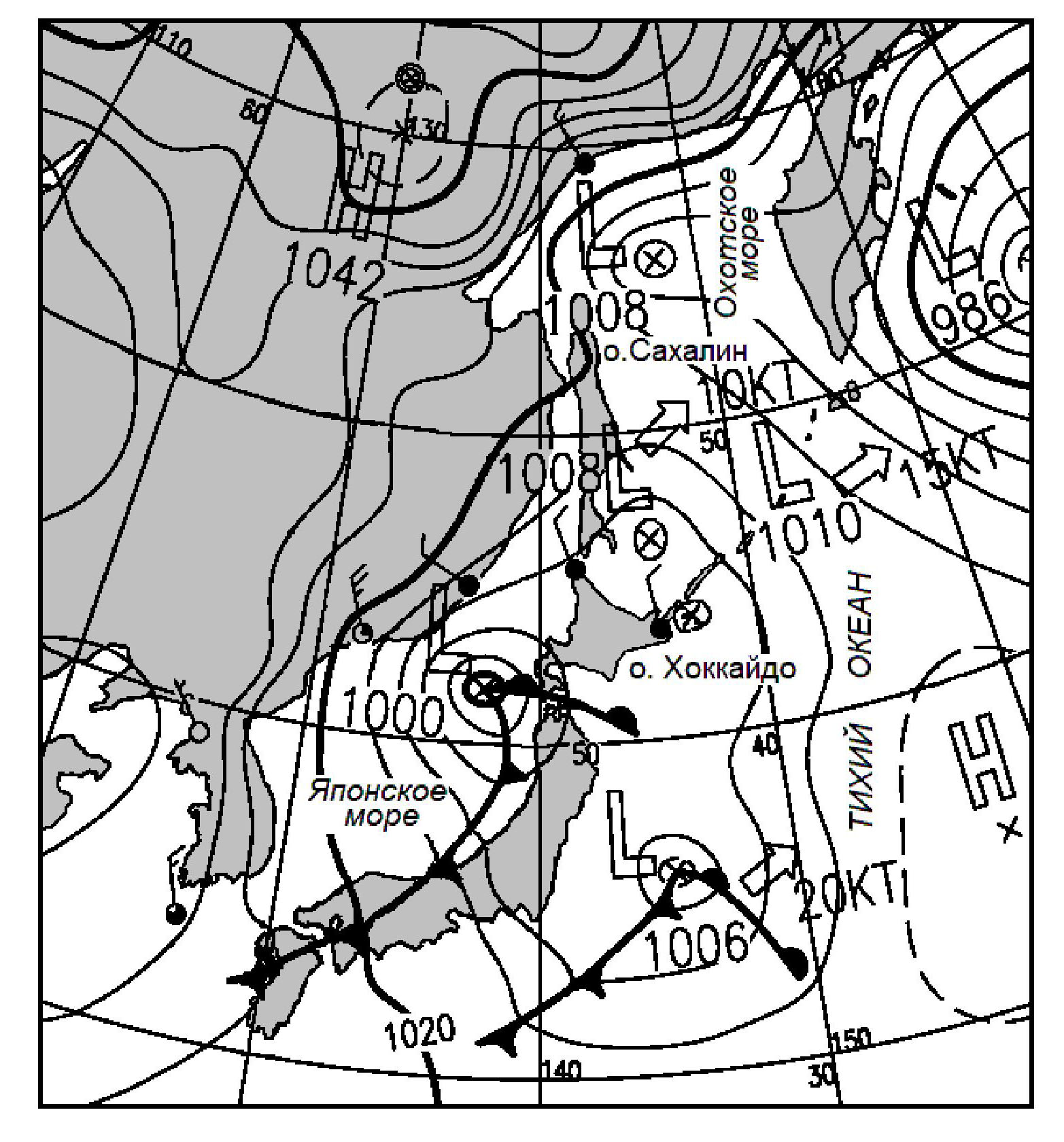Рассмотрим условия генерации таких колебаний. Они могут быть разными [14], но обычно связаны с атмосферными возмущениями. На рис. 6 приведен фрагмент синоптической карты с сайта погоды rp5.ru за 20.01.2023 г. на 06:00. Видно, что на момент образования в бухтах сейш большой амплитуды над южной оконечностью о. Сахалин перемещался циклон, который сопровождался продолжительными северо-северо-восточными ветрами со скоростями 7–19 м·с–1 и порывами до 15 м·с–1. Очевидно, что генерация сейш вызвана воздействием этого циклона. В то же время фоновое волнение к моменту начала генерации сейш не превышало 5 см для волн с периодами до 10 мин. А штормовые волны пришли в пункты наблюдения через 12 ч после появления сейш максимальной амплитуды и достигли своего максимума в 70 см через 21 ч.