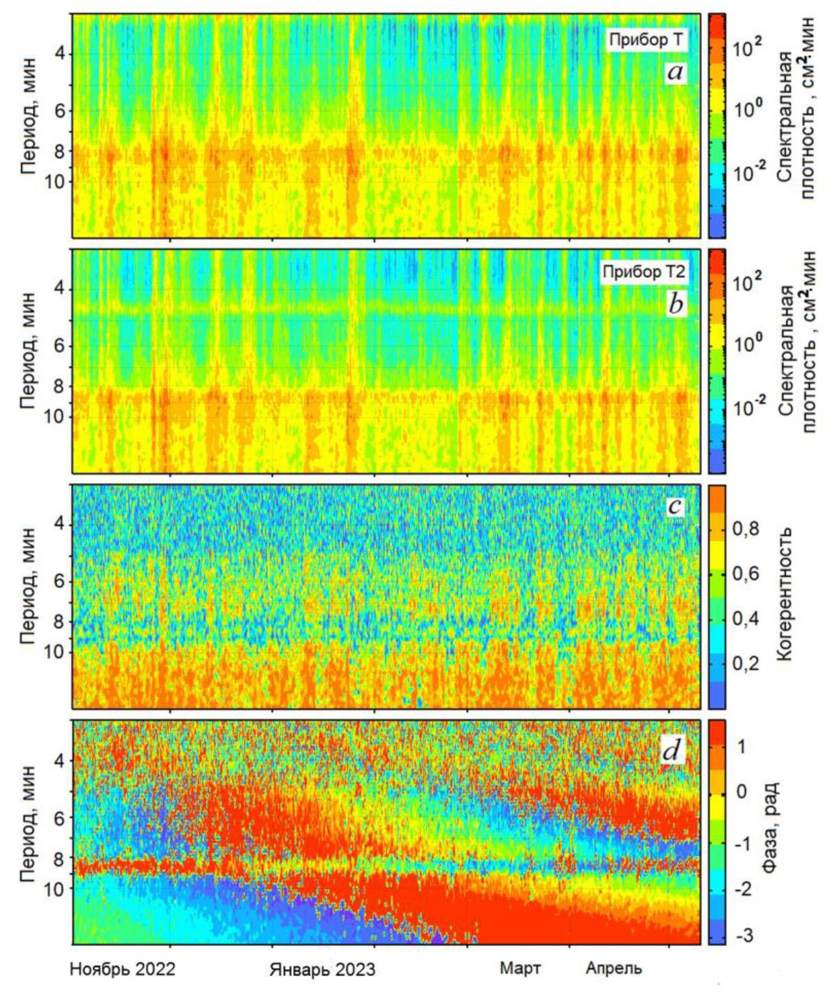 Взаимодействие колебаний в соседних бухтах хорошо показывает спектрограмма разности их фаз (рис. 9, d). Здесь на периодах 8–9 мин присутствует стабильная горизонтальная полоса для всего периода наблюдений, соответствующая диапазону периодов собственных колебаний бухт. При этом в январе 2023 г. колебания были близки к синфазным, а в марте – апреле 2023 г. – к противофазным. Также в этой полосе наблюдается достаточно медленное циклическое изменение фазы. Такой эффект нами был обнаружен и затем описан в работе [1], он объясняется синхронизацией колебаний в бухте приходящими на вход волнами 4.