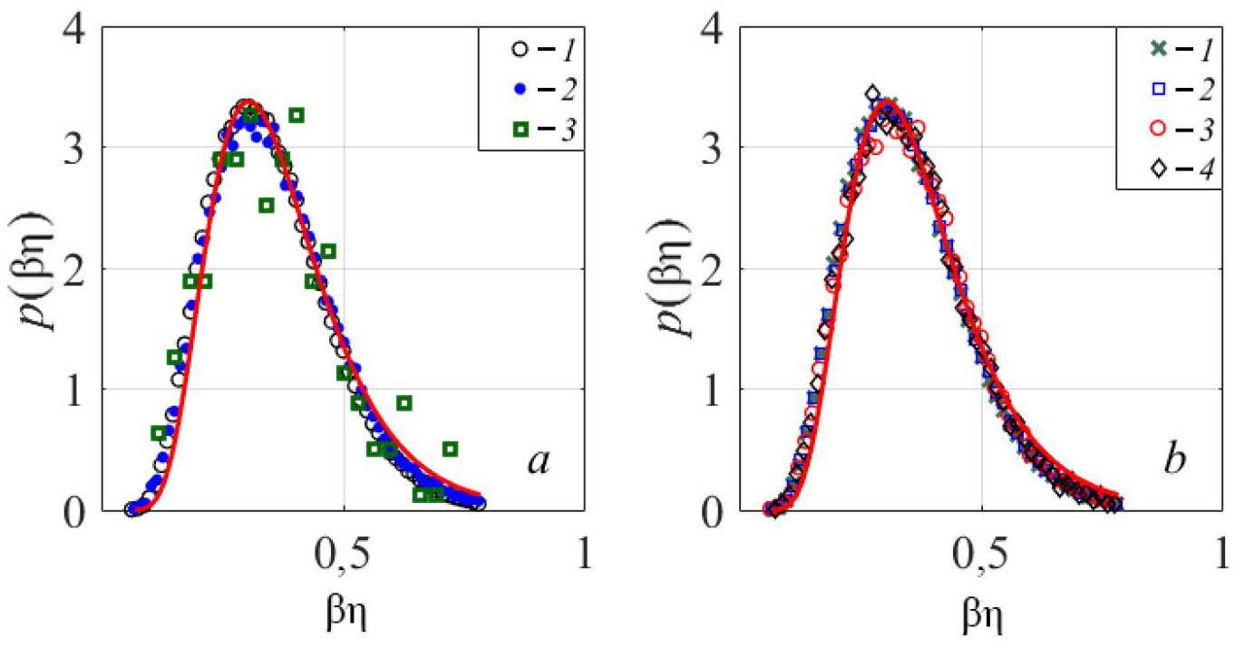 Определим распределения p(βη) при различных наблюдаемых скоростях барашков. Разобьем диапазон всех измеренных (1–8 м/с) на три интервала с шагом ∆Cwb=2,5 м/с. На рис. 2, a символами показаны распределения p(βη) в выбранных интервалах скоростей обрушений (цифры в легенде). Все плотности вероятностей p(βη) практически совпадают, и вся совокупность точек удовлетворительно описывается функцией (1), показанной красной линией.