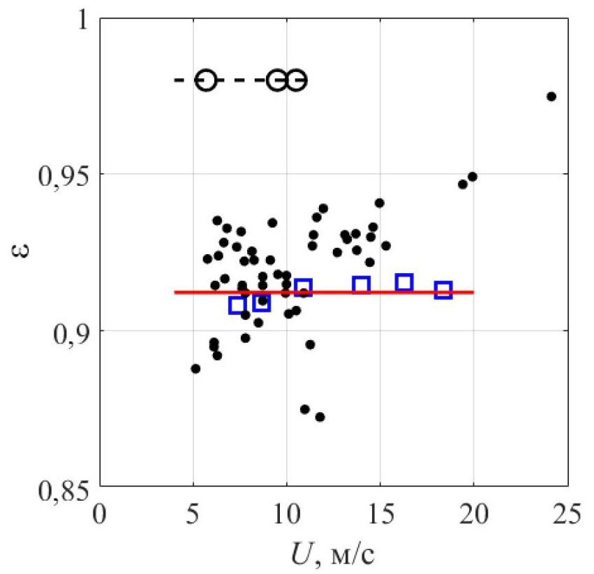На рис. 4 квадратиками показана ветровая зависимость рассчитанных нами ε, сплошной линией – среднее значение ⟨ε⟩, равное 0,91; светлые кружочки соответствуют данным работы [1], темные – данным работы [14].