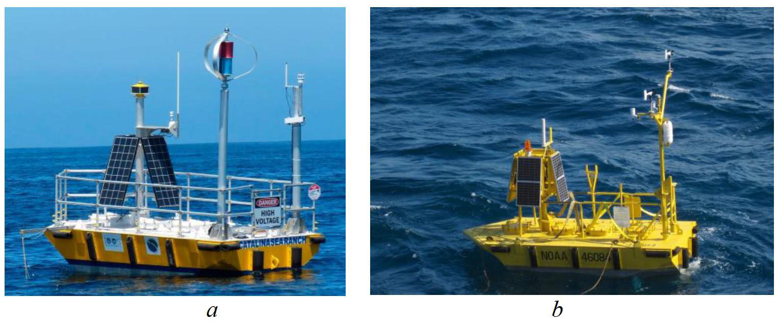 Рис. 1. Морские плавучие станции для решения задач оперативной океанологии компании Catalina Sea Ranch (a); береговой охраны США (b)
