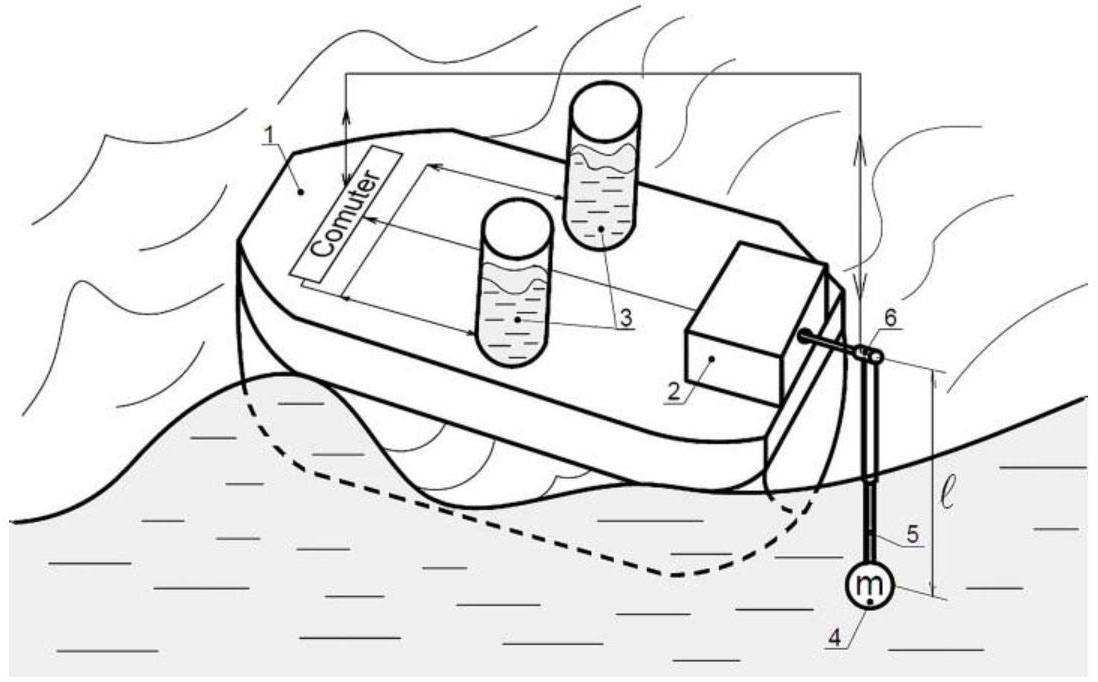 Станция с ВПГ (рис. 4) состоит из корпуса 1 с положительной плавучестью, механизма преобразования энергии 2, балластных цистерн 3, маятника с чувствительной массой 4 и вычислителя. Корпус станции должен иметь форму, приближенную к цилиндрической, в связи с тем, что эта форма имеет наименьшее сопротивление при бортовой качке. Маятник может изменять длину подвеса за счет изменения длины l телескопической штанги 5 с помощью привода телескопической штанги 6. Балластные цистерны 3 должны быть оснащены уровнемерами, а подача воды и ее слив из цистерн должны производиться с помощью насоса и сливных клапанов, которые на рис. 4 не показаны.