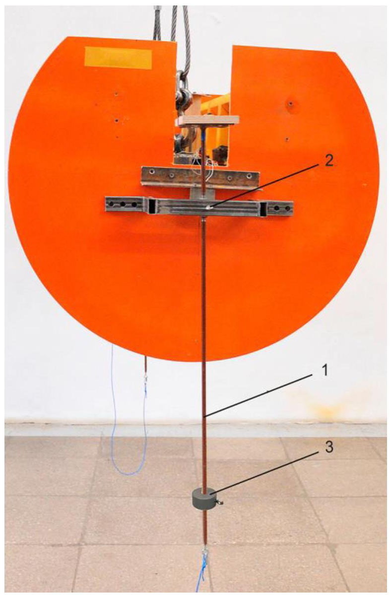 Fig. 8. One of two pendulum systems fixed on the model sides: 1 – rod; 2 – rod rotation shaft fixed on the axis of the models’ center of mass; 3 – load with a screw stop moving along the rod