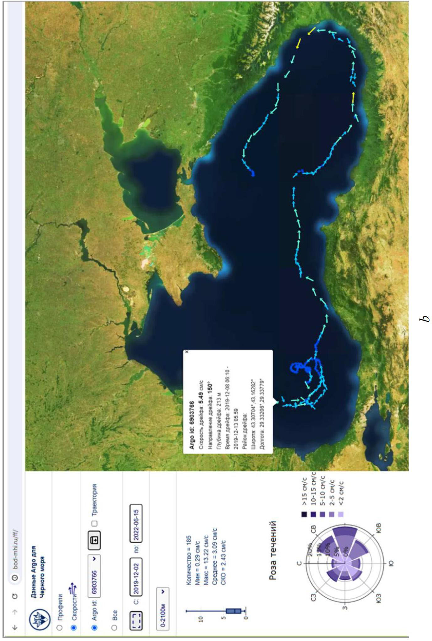Рис. 4b. Пример использования веб-интерфейса для отображения: a – траектории буя Argo ID 6903766 и вертикальных профилей температуры и солености; b – его скоростей дрейфа
