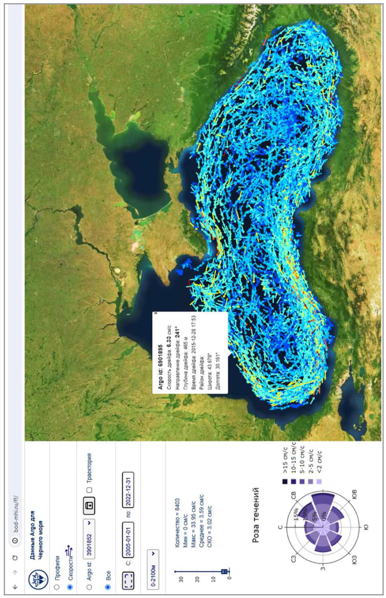 Геоинформационная система. Оценка скоростей дрейфа буев Argo проводилась на основе анализа расчета их средней скорости с использованием ГИС, доступной на сайте http://www.bod-mhi.ru/ff/ 4. Источником данных для ГИС были файлы данных буев Argo в форматах netCDF и csv, содержащие информацию о номере буя, его местоположении, времени начала профилирования, измеренных параметрах, а также отдельные файлы с метаданными, в которых представлена информация о глубине подводного дрейфа до начала профилирования. Реальная глубина дрейфа в течение рабочего цикла известна практически для всех буев, за исключением буев с номерами 7900465, 7900466, 4900540, 4900541, 4900542, 4900489. Для этих буев применялся такой же метод ее проверки, как и в работе [8]. При этом использовались данные из раздела описания буев (циклы профилирования, глубина измерений и глубина дрейфа) на сайте 1, указанная глубина дрейфа проверялась на соответствие фактически проведенным наблюдениям (глубина начала профилирования и глубина места должны быть не меньше заявленной глубины дрейфа). Подобные проверки проводились и в работе [3, c. 769].