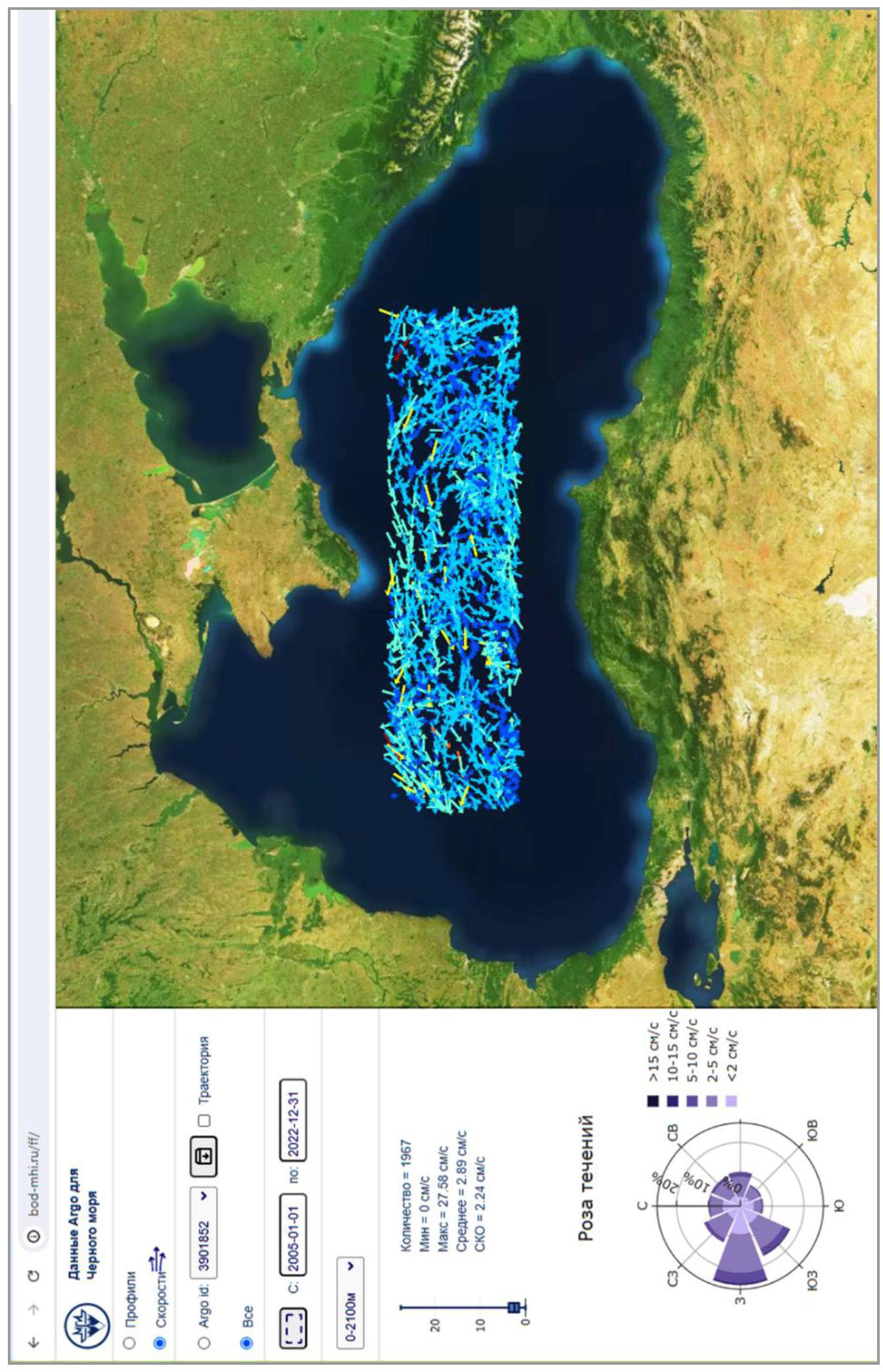 Conclusions. The online services of the Argo project is complemented by the developed GIS, that simplifies significantly processing and scientific analysis of the Black Sea oceanographic data; in other words, there is no need to use additional scripts, data downloads and external visualization systems. The examples of applying the system for estimating the float drift velocities at different depths and in certain parts of the sea are shown. In future, GIS can be supplemented with new modules, such as automatic downloading of Argo data, operating with similar data arrays obtained, for example, from the drifters or ADCP current profilers, besides, it can applied to any other region.