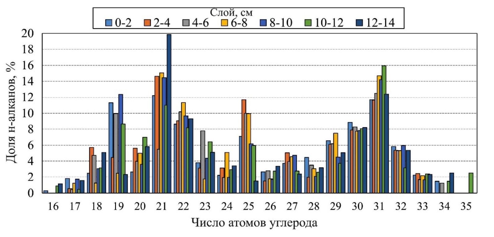 Отмечено достаточно равномерное распределение исследуемых веществ по горизонтам в диапазоне глубин от 0 до 10 см, где содержание углеводородов колебалось в пределах 24,5 до 33,0 мг/кг (рис. 7). В более глубоких слоях (10–12 и 12–14 см) отмечено понижение концентрации углеводородов до 8,0–14,0 мг/кг. Содержание н-алканов в слоях колонки колебалось в пределах 2,5–11,4 мг/кг. Доля н-алканов от углеводородов была относительно стабильной, ее средняя величина составляла 31 % при колебаниях от 29 до 36 %.