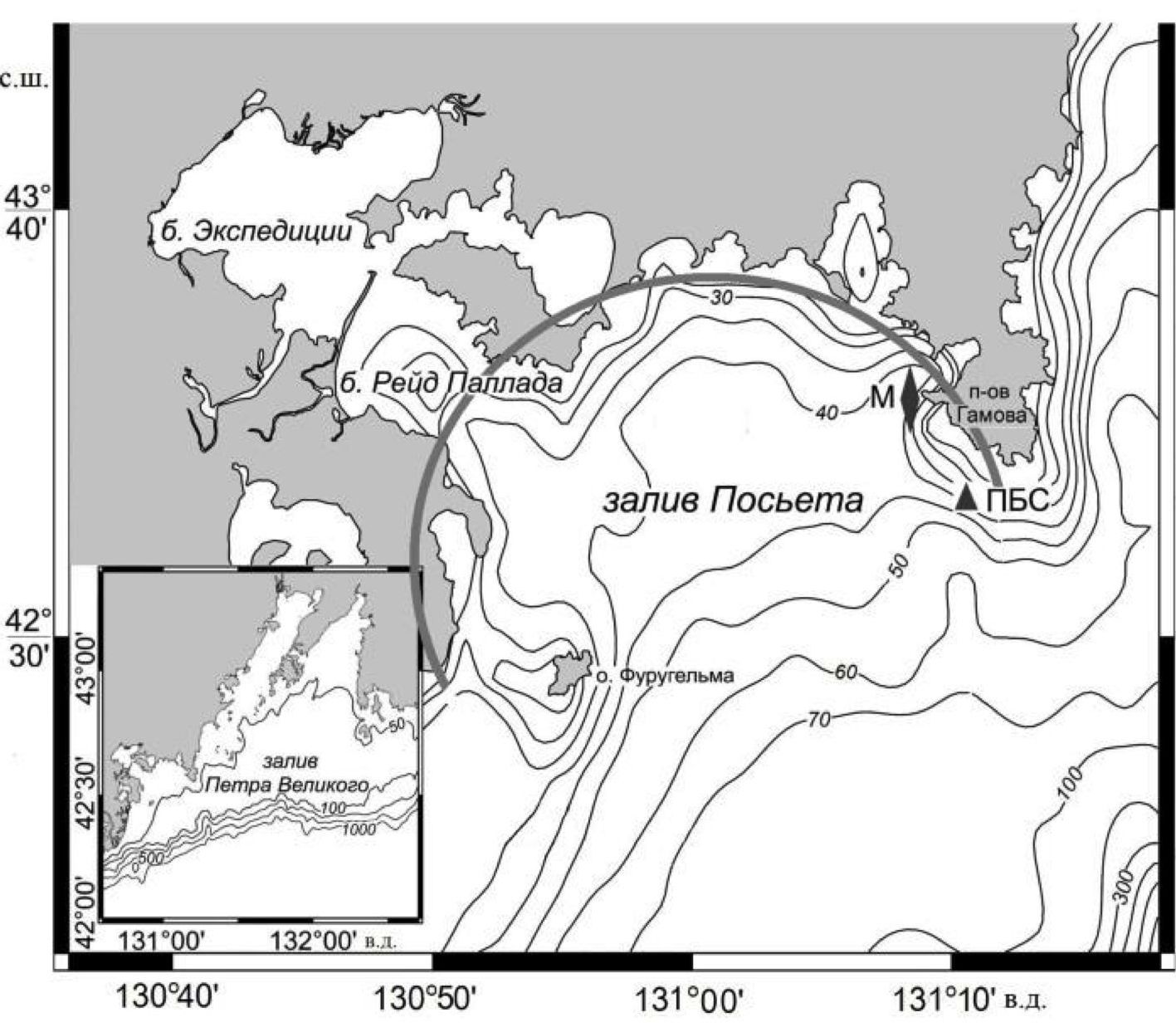 Р и с. 1. Карта-схема залива Посьета. На врезке показан залив Петра Великого